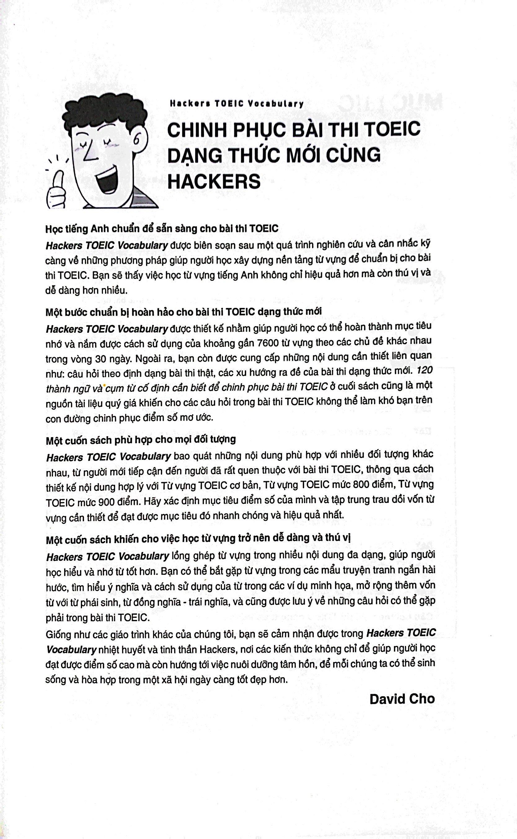 Nội dung: Hackers TOEIC Vocabulary là cuốn sách được thiết kế nhằm giúp người học có thể hoàn thành mục tiêu nhớ và nắm được cách sử dụng của khoảng gần 7600 từ vựng theo các chủ đề khác nhau trong vòng 30 ngày. Ngoài ra, bạn còn được cung cấp những nội dung cần thiết liên quan như: câu hỏi theo định dạng bài thi thật, các xu hướng ra đề của bài thi dạng thức mới. “120 thành ngữ và cụm từ cố định cần biết để chinh phục bài thi TOEIC” ở cuối sách cũng là một nguồn tài liệu quý giá khiến cho các câu hỏi trong bài thi TOEIC không thể làm khó bạn trên con đường chinh phục điểm số mơ ước.