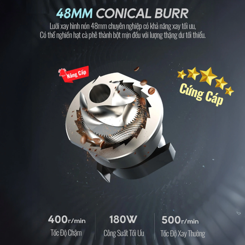 - Với lưỡi dao chất liệu thép không gỉ SS420 bền bỉ bền bỉ sở hữu 36 cấp độ xay, từ dạng thô đến dạng mịn. Chính vì thế nó có thể đáp ứng tối thiểu độ mịn cho 1 ly cà phê espresso chuẩn Ý.