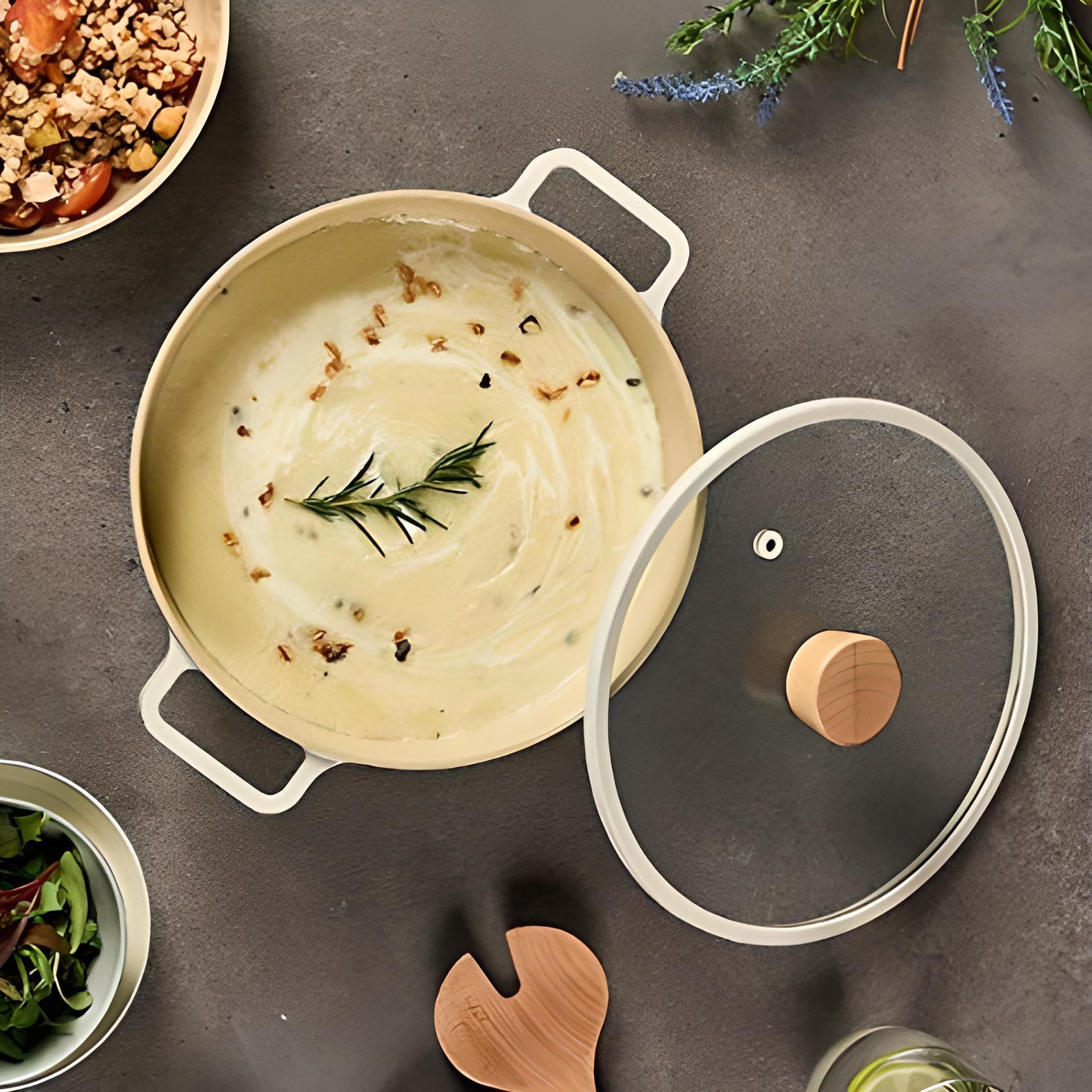 Đáy 3 lớp truyền nhiệt nhanh – giúp nấu chín đều, tiết kiệm thời gian Vung kính chịu nhiệt có lỗ thoát hơi – tiện theo dõi món ăn không cần mở nắp Chất liệu