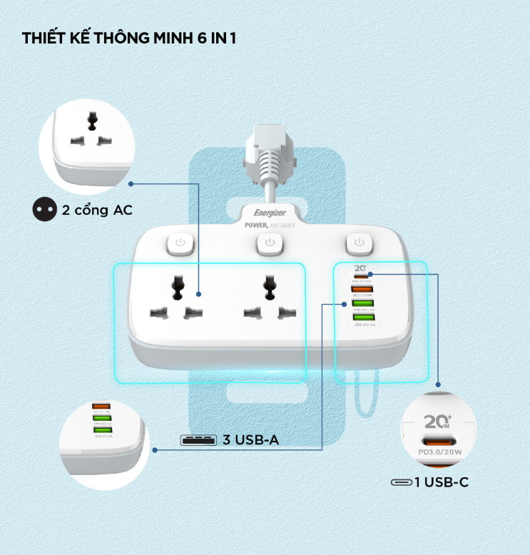 Ổ cắm 3 ổ đa năng + 2 ổ cắm USB cách điện bền đẹp - Chịu nhiệt, chống cháy: 750 độ C - Chiều dài dây điện: 1.8 mét - Chân tiếp xúc với