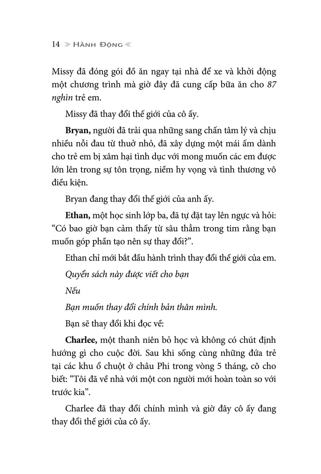 Và quyển sách này – Change Your World: How Anyone, Anywhere Can Make a Difference sẽ giúp bạn mở mang tầm mắt, để bạn có thể nhìn môi trường xung quanh với một góc nhìn thật khác biệt – đó là tiền đề cho quá trình thay đổi cách sống và thậm chí là biến đổi thế giới xung quanh bạn.