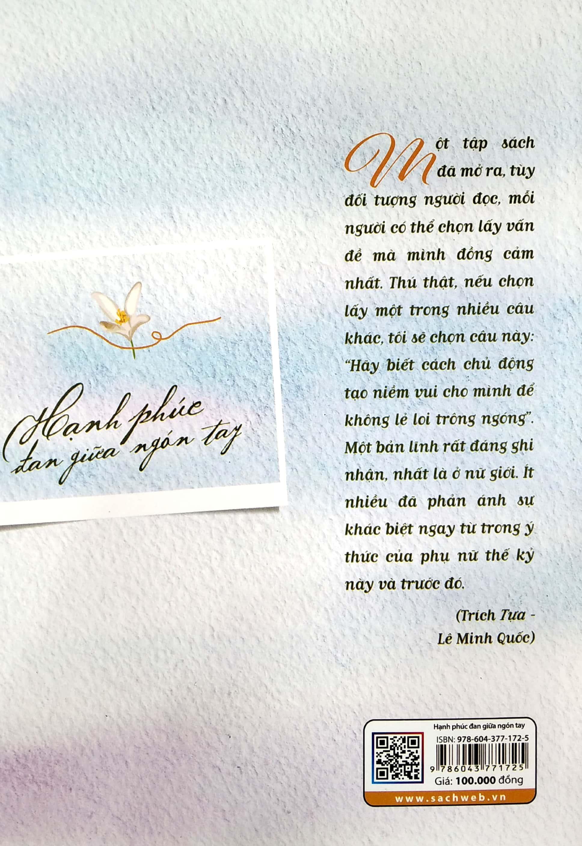 Hạnh Phúc Đan Giữa Ngón Tay của tác giả Minh Hương. Nguyễn là quyển sách viết theo tâm thế “Trong đời sống này, sự khổ đau hay sung sướng, hoan lạc hay sầu thảm cũng chính là từ lúc chúng ta tự ý thức gieo lấy hạt giống gì trong ngay trong lòng mình. Gieo niềm vui gặt tiếng cười. Gieo âu lo gặt phiền muộn. Gieo gió gặt bão”.