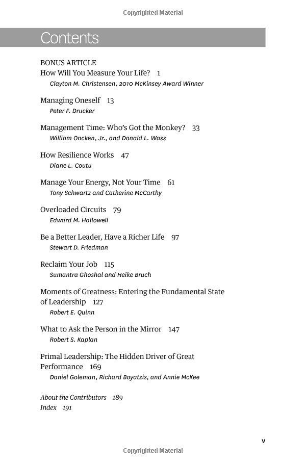 The path to your professional success starts with a critical look in the mirror. If you read nothing else on managing yourself, read these 10 articles (plus the bonus article "How Will You Measure Your Life?" by Clayton M. Christensen). We've combed through hundreds of Harvard Business Review articles to select the most important ones to help you maximize yourself. HBR's 10 Must Reads on Managing Yourself will inspire you to: Stay engaged throughout your 50+-year work life Tap into your deepest values Solicit candid feedback Replenish physical and mental energy Balance work, home, community, and self Spread positive energy throughout your organization Rebound from tough times Decrease distractibility and frenzy Delegate and develop employees' initiative This collection of best-selling articles includes: bonus article "How Will You Measure Your Life?" by Clayton M. Christensen, "Managing Oneself," "Management Time: Who's Got the Monkey?"
