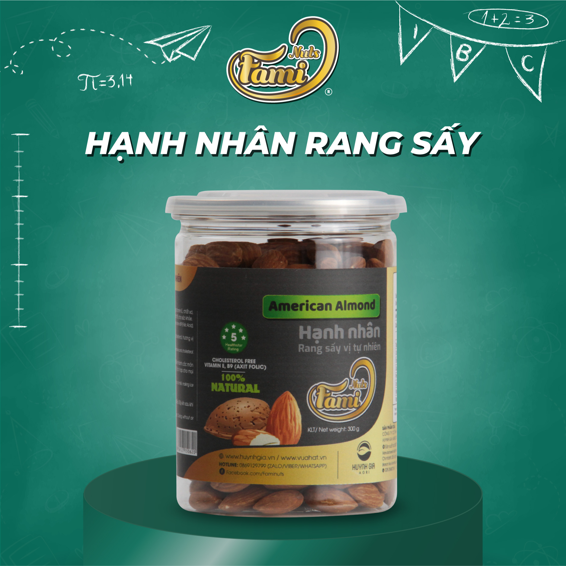 - Được sấy khô, rang chín trong dây chuyền khép kín hiện đại của Huỳnh Gia Agri. Giúp hạt hạnh nhân giữ được nguyê vị béo, hương thơm nguyên bản của hạnh nhân, phù hợp cho mọi đối tượng sử dụng, dùng được cho người ăn kiêng.