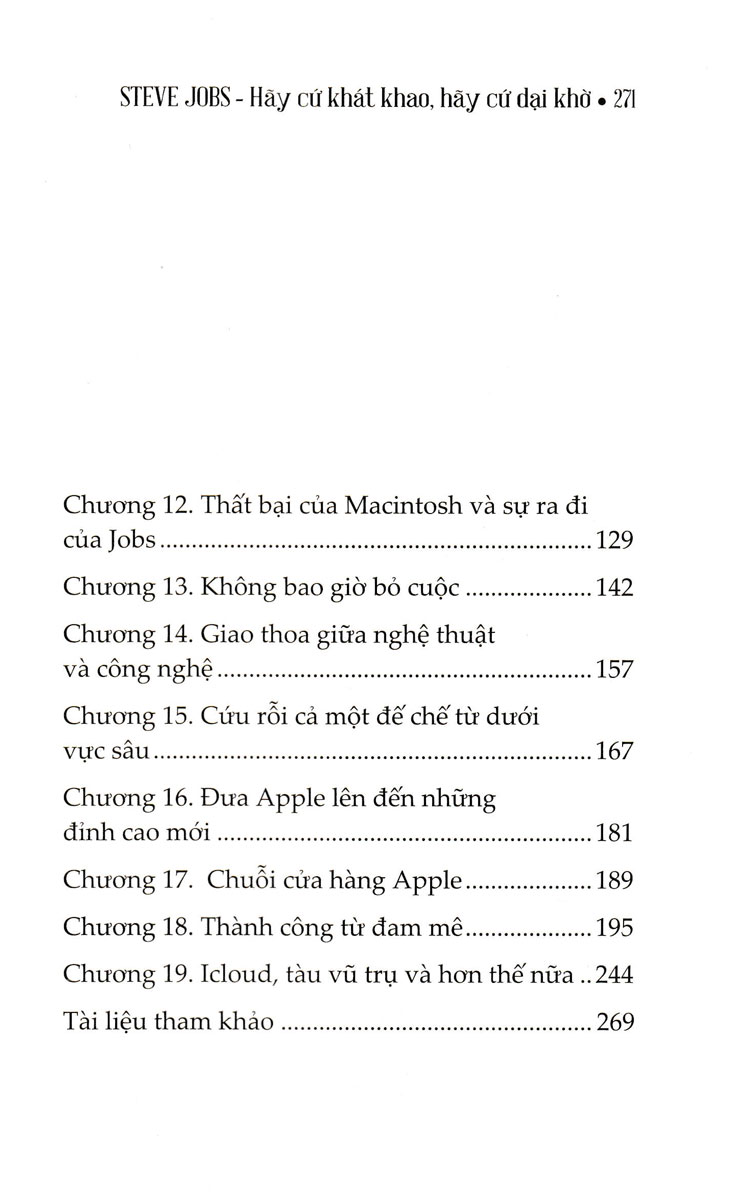 Hãy Cứ Khát Khao Hãy Cứ Dại Khờ (Sbooks) STAY HUNGRY, STAY FOOLISH - THẾ GIỚI NÀY KHÔNG VÌ BẠN LÙI BƯỚC MÀ SẼ TRỞ NÊN DỊU DÀNG VỚI BẠN HƠN, HAY CUỘC ĐỜI BẠN SẼ TRỞ NÊN TỐT ĐẸP HƠN. THẾ NÊN, HÃY CỨ KHÁT KHAO ĐI, KHÁT KHAO BẰNG TẤT CẢ NHỮNG GÌ BẠN CÓ. HÃY CỨ DẠI KHỜ ĐI, HÃY DẠI KHỜ TIN RẰNG KHÁT KHAO CỦA MÌNH NHẤT ĐỊNH SẼ TRỞ THÀNH HIỆN THỰC. Đây chắc chắn là nguồn cảm hứng tuyệt vời nhất bạn tìm thấy được từ cuộc đời của một thiên tài công nghệ Steve Jobs. Bên cạnh những nỗ lực ấn tượng liên quan đến sự ra đời của Apple, chắc chắn rất ít người biết Steve Jobs đã từng thực hiện một chiến dịch thương hiệu - một chiến dịch thể hiện rõ ràng tư duy, quan điểm, và thái độ của những người gia nhập vào ngành công nghệ. Steve Jobs từng nói: “Đó không phải vấn đề tốc độ xử lý hay bộ nhớ, nó nói về sự sáng tạo. Ở Apple chúng tôi đã quên mất mình là ai. Có một cách để nhớ bạn là ai, đó là nhớ ai là người hùng của bạn. Đây là cốt lõi của chiến dịch này”. Chiến dịch này không chỉ nhắm tới các khách hàng tiềm năng mà còn hướng tới các nhân viên của Apple. Họ đã dùng cụm từ “Tư duy khác biệt” và cũng như những người điên, “bởi chỉ những người đủ điên khùng để nghĩ họ có thể thay đổi thế giới chính là những người thay đổi thế giới”. Jobs phát biểu: Apple hướng tới những người có tư duy vượt khỏi khuôn khổ, những người muốn dùng máy tính để giúp họ thay đổi thế giới. Ngoài quảng cáo thương mại trên truyền hình, họ đã thực hiện một trong những chiến dịch quảng cáo in đáng nhớ nhất trong lịch sử. Họ cho in các tờ quảng cáo có hình các nhân vật lịch sử dễ nhận diện như Einstein, Lennon, Dylan, Picasso, Edison, Chaplin, King… với biểu tượng của Apple và dòng chữ “Tư duy khác biệt” ở góc. Điều gây tò mò ở quảng cáo này là họ in cả chân dung của những người không dễ nhận ra khiến người ta phải dừng lại và bàn tán nhau. Những người này thường có điểm chung là những người sáng tạo và chấp nhận rủi ro, không ngại thất bại và đánh cược cả sự nghiệp của mình để làm việc theo những cách khác biệt. Ý tưởng của việc quảng cáo này là động viên mọi người khẳng định chính họ như những cá thể độc lập, sáng tạo, đổi mới một cách táo bạo chỉ đơn giản bằng chiếc máy tính mà họ dùng. HÃY CỨ KHÁT KHAO, HÃY CỨ DẠI KHỜ chính là bức tranh toàn diện về cuộc đời cảm hứng của “Cha đẻ” Apple - Steve Jobs. Ở đây, bạn có thể tìm thấy những thông tin, những tuyên ngôn thuộc về Steve Jobs mà trước đây chưa ai đề cập với bạn.
