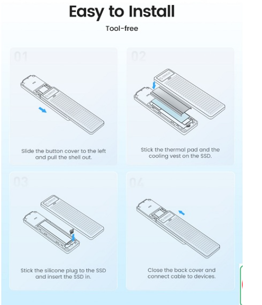 Việc cài đặt và sử dụng hộp đựng này rất đơn giản. Bạn chỉ cần mở nắp, lắp ổ cứng SSD vào vị trí phù hợp và sau đó kết nối với máy tính của bạn thông qua cổng Type-C. Không cần cài đặt phần mềm phức tạp, bạn có thể bắt đầu sử dụng ngay lập tức.
