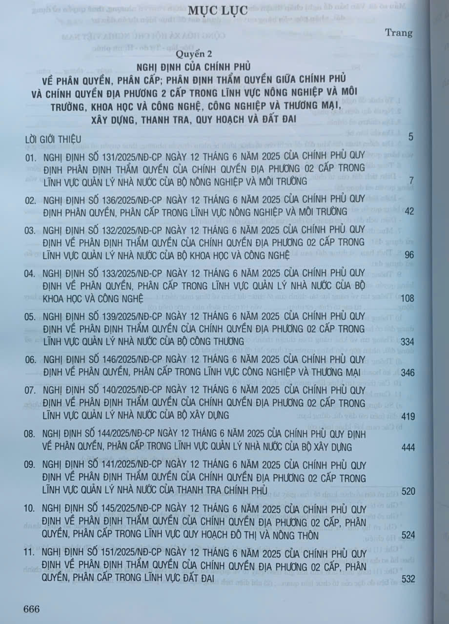 Quyển 2: Hệ thống các nghị định của Chính phủ về phân quyền, phân cấp; phân định thẩm quyền Chính phủ và chính quyền địa phương 2 cấp trong lĩnh vực nông nghiệp và môi trường, khoa học và công nghệ, công nghiệp và thương mại, xây dựng, thanh tra, quy hoạch và đất đai
