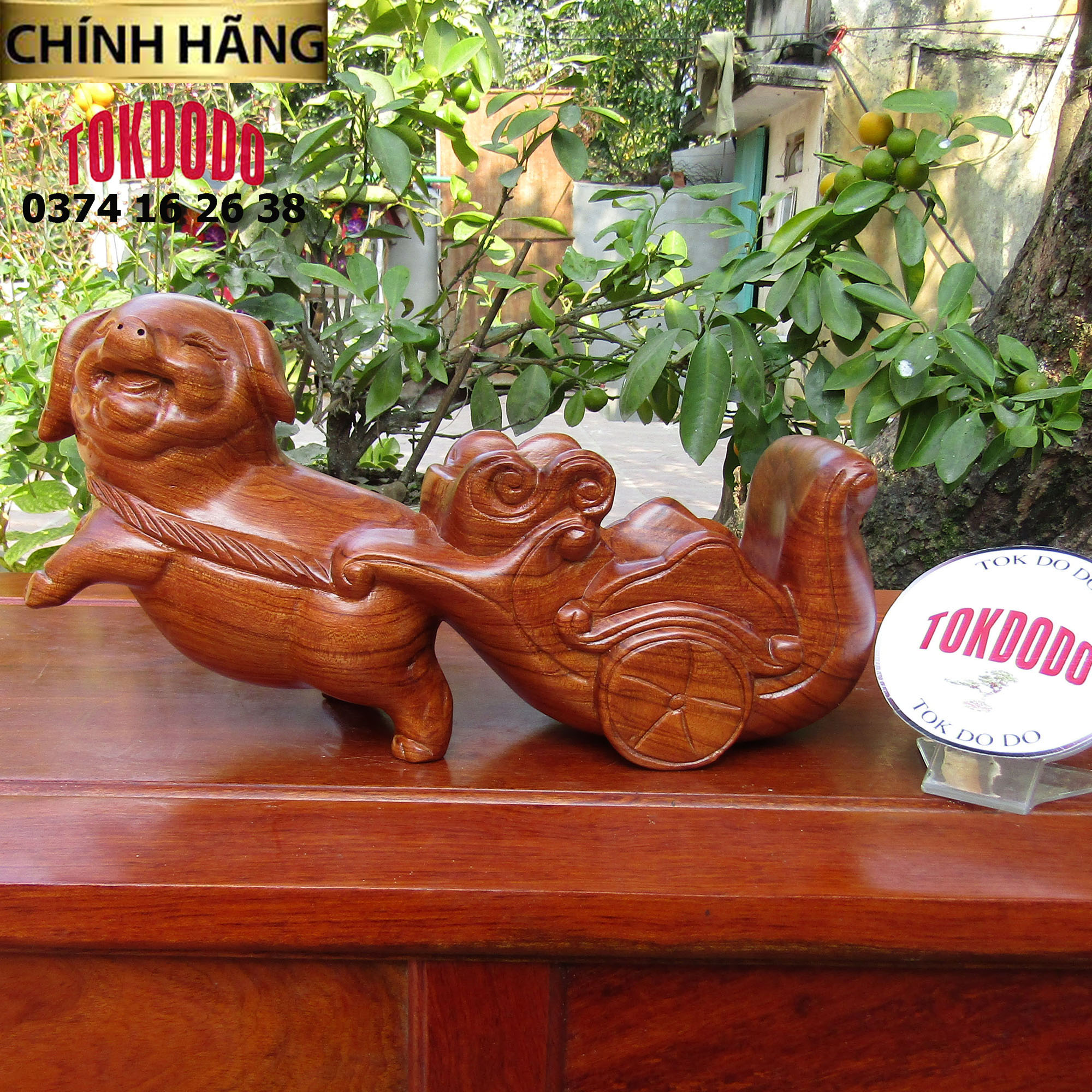 ✨Heo tài lộc kéo xe để rượu vang bằng gỗ hương nguyên khối Thương Hiệu TOKDODO