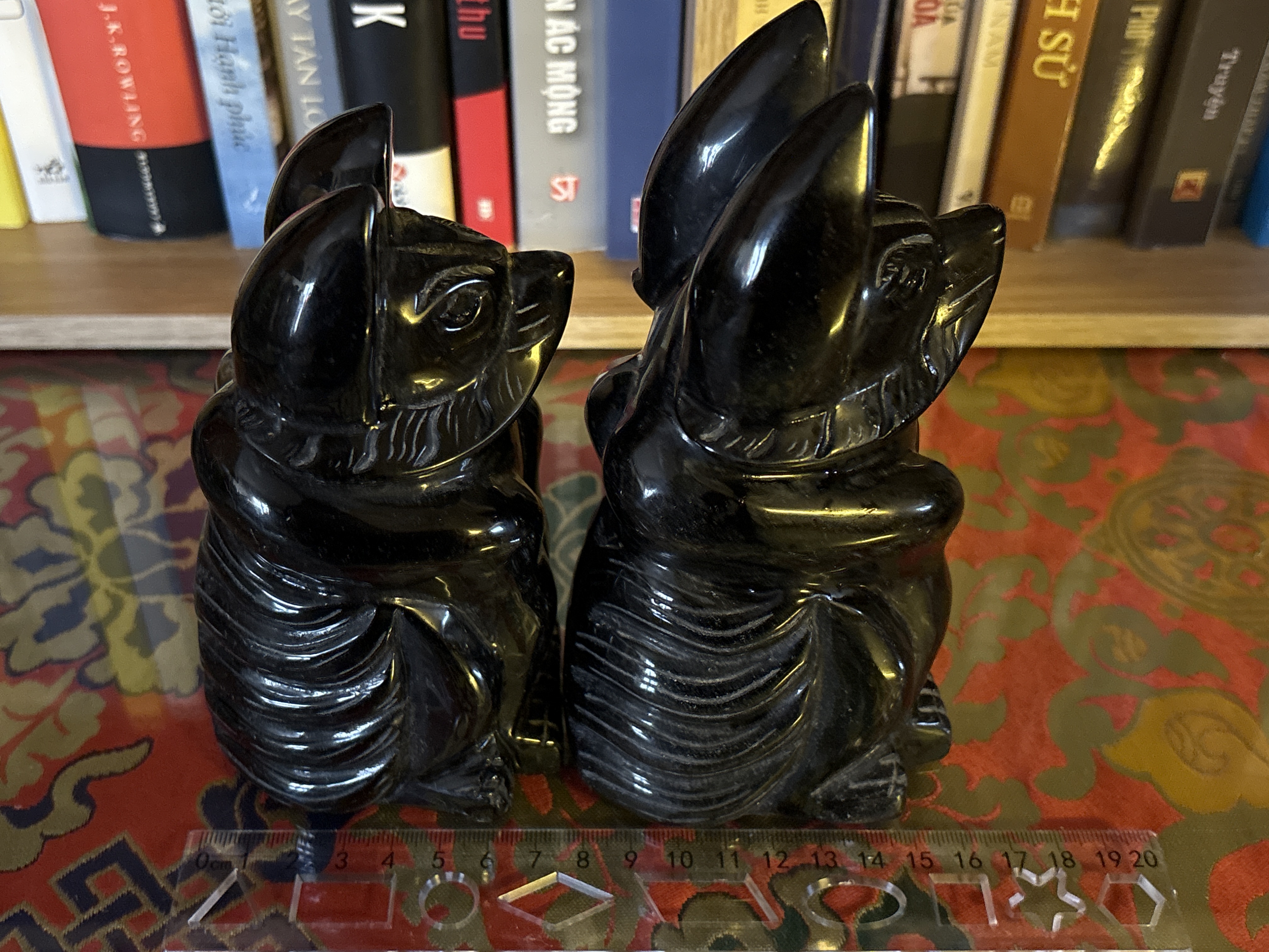 Tượng Hồ ly 9 đuôi chạm khắc tinh sảo bằng đá tự nhiên Obsidian. Kích thước 14cm và 16cm Hồ ly phong thủy - biểu tượng may mắn trong tình yêu Tượng