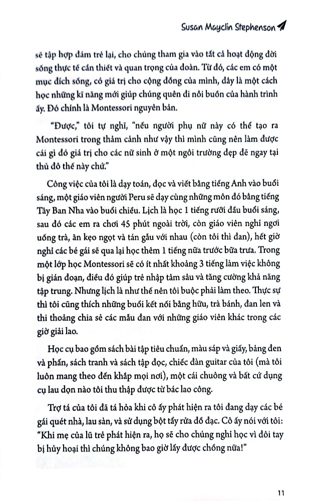 Trong hành trình 50 năm cống hiến cho sự nghiệp giáo dục, Susan Stephenson đã sống ở 5 châu lục, đi đến hơn 70 quốc gia, hoạt động giảng dạy, cố vấn tại hơn 35 nước. Tác giả từng cố vấn cho nhiều trường Montessori, trại mồ côi, trường cho người tị nạn - có hoàn cảnh khó khăn, thậm chí cả những trường không có học cụ Montessori.
