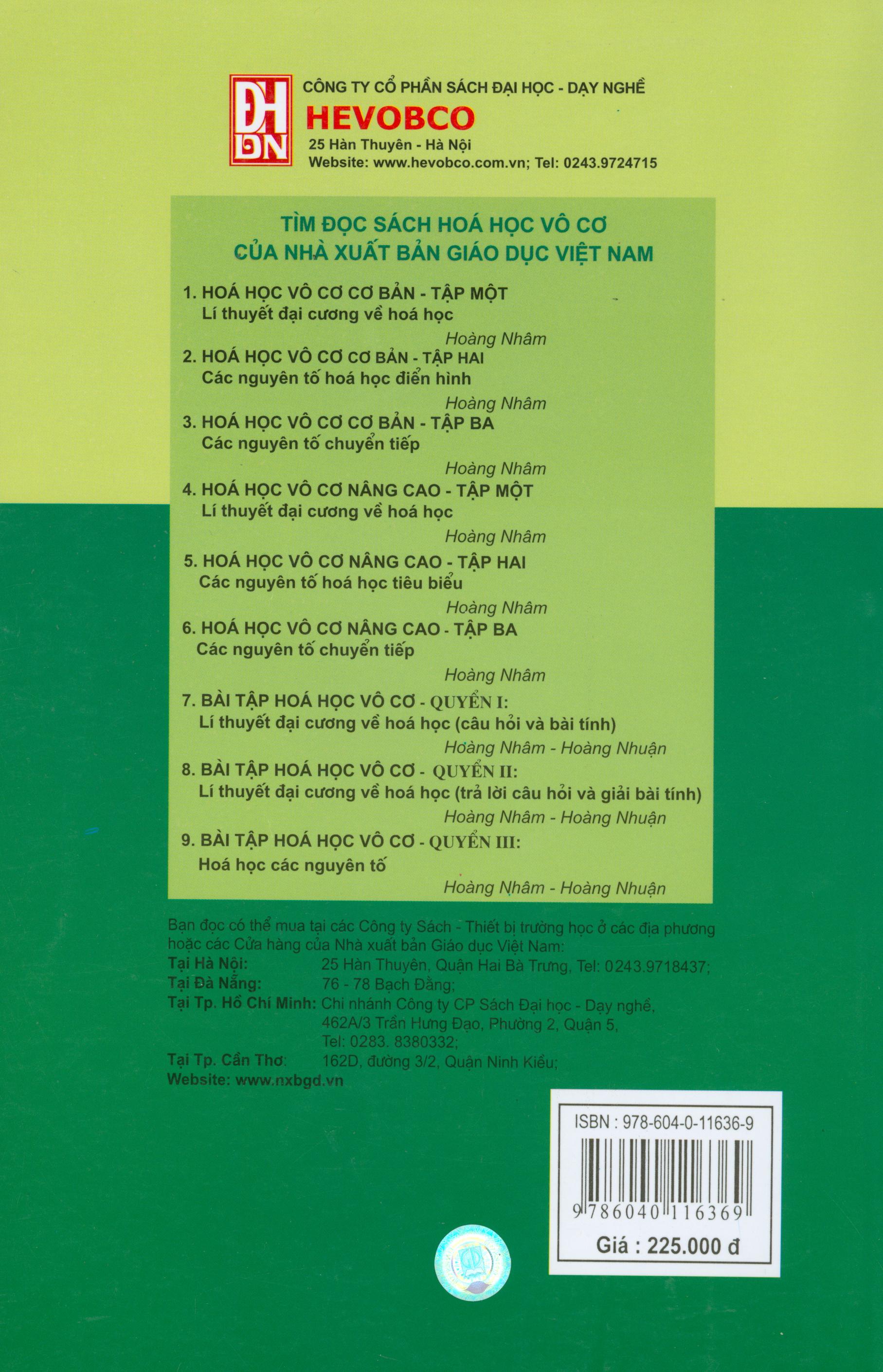 Trước tình hình đó, học tập kinh nghiệm của một số nước tiên tiến trên thế giói về khoa học và giáo dục, tôi viết bổ sung thêm vào bộ sách Hóa học Vô cơ nhiều kiến thức hiện đại về hoá học lý thuyết cần thiết cho môn học và nhiều kiến thức hiện đại về hoá học ứng dụng nhằm xây dựng một hành trang khá vững chắc và toàn diện về Hoá học Vô cơ cho học sinh các trường năng khiếu, sinh viên các trường cao đẳng và đại học, nghiên cứu sinh, thầy giáo trẻ và nhà nghiên cứu trẻ quan tâm nhiều đến hoá học. Bởi vậy sách tham khảo này được gọi là Hóa học Vô cơ nâng cao. Tập một của bộ sách trình bày lý thuyết đại cương về hoá học ; tập hai trình bày hoá học các nguyên tố tiêu biểu và tập ba trình bày hoá học các kim loại chuyển tiếp.