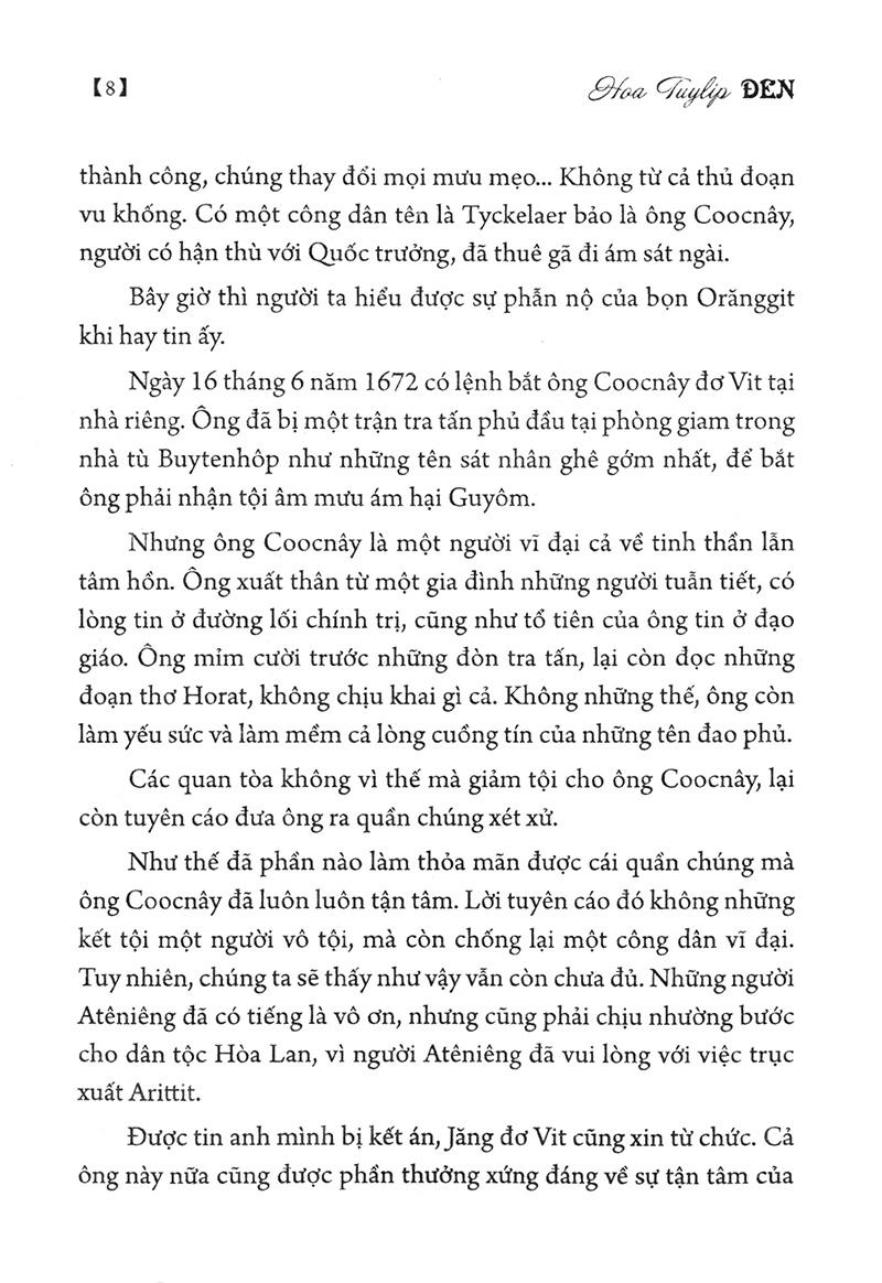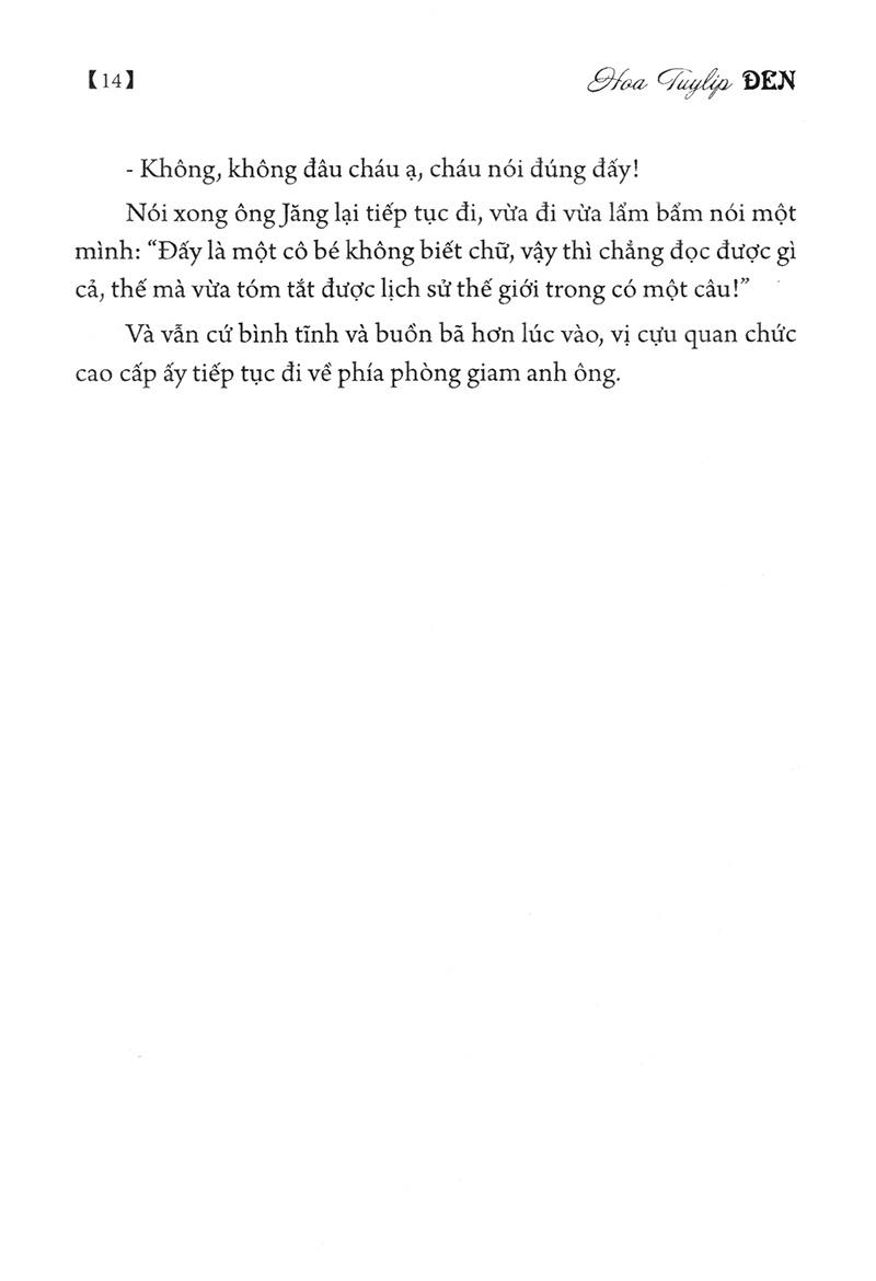 Hoa Tuy líp đen - một câu chuyện nhẹ nhàng, lãng mạn, và cổ tích – Hoa Tulip đen khác hẳn so với những gì mà trước đó Alexandre Dumas (cha) đã viết. Nó nhẹ nhàng, lãng mạn, như một câu chuyện cổ tích đẹp và có hậu.