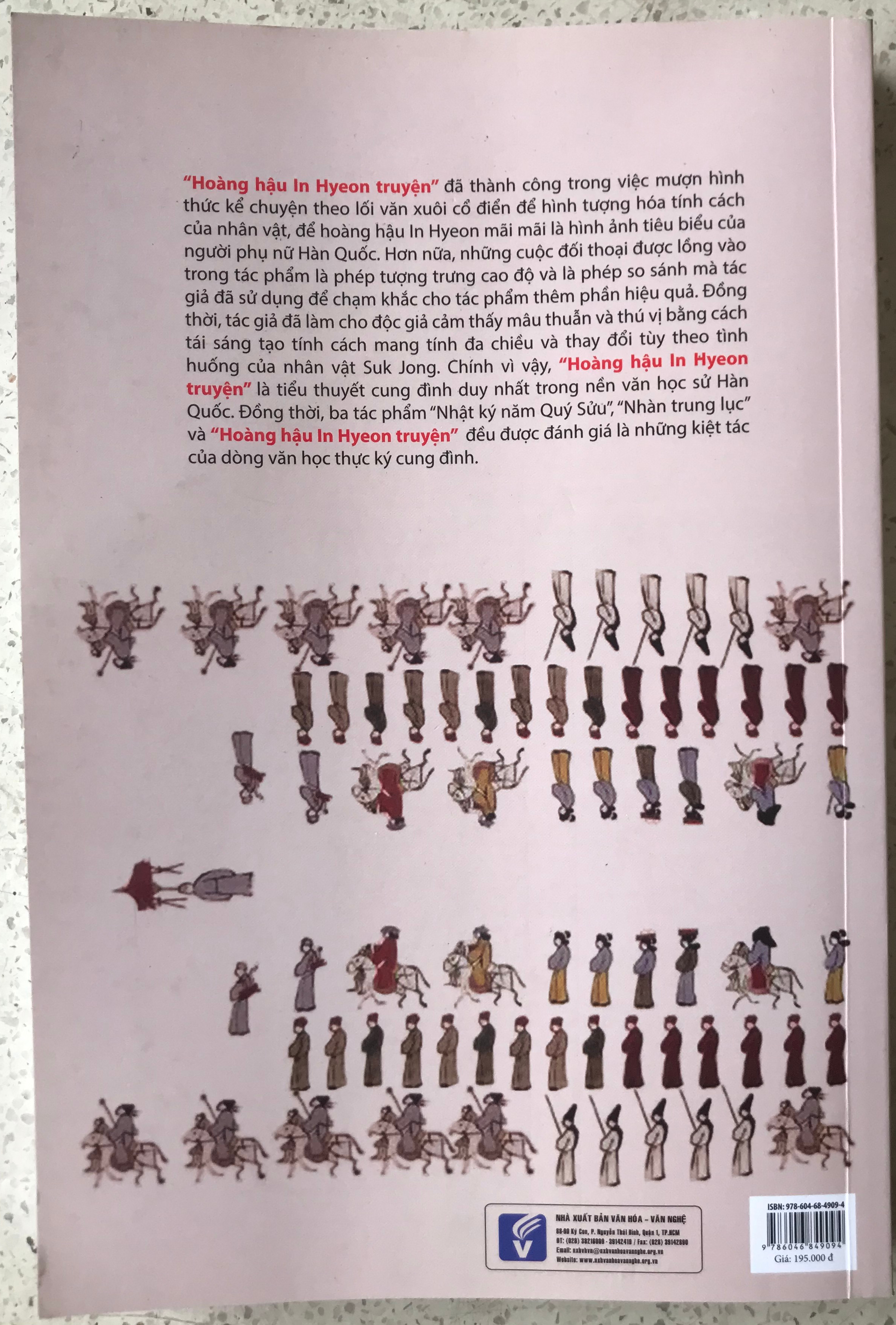 " Hoàng hậu In Hyeon truyện" là tác phẩm tiểu thuyết cung đình duy nhất trong lịch sử văn học Hàn Quốc. Cuộc đời của hoàng hậu In Hyeon tuy ngắn ngủi (35 năm), nhưng người phụ nữ ấy vẫn sống mãi bên cạnh chúng ta cho đến ngày hôm nay. Thuở nhỏ, nàng In Hyeon vô củng hiếu thảo với mẹ kế. Sự khéo léo của nàng (thêu thùa và dệt vải) vượt trội ơn người như có thần linh giúp đỡ, nhưng nàng không hề hãnh diện về điều đó. Nhờ vậy mà nàng được chọn làm hoàng hậu. Sau khi lên ngôi hoàng hậu, nàng đối xử hết lòng với bề trên (bà cố của vua và mẹ của vua), nàng cai quản hậu cung và các cung nữ bằng lỏng tốt của mình. Vì vậy, nàng In Hyeon trở thành tấm gương cho công chúng. Hơn nữa, khi bị phế truất bởi mưu kế hãm hại của hy tần Jang, nàng In Hyeon vẫn không hề oán hận người khác. Khi được phục vị, nàng cũng không hề khác trước kia. Chính vì vậy, hình ảnh hoàng hậu In Hyeon trươc sau như một, không dễ dàng thay đổi khi gặp nạn, được xem là mẫu người lý tưởng nhất, phù hợp đạo lý của thời đại lúc bấy giờ.
