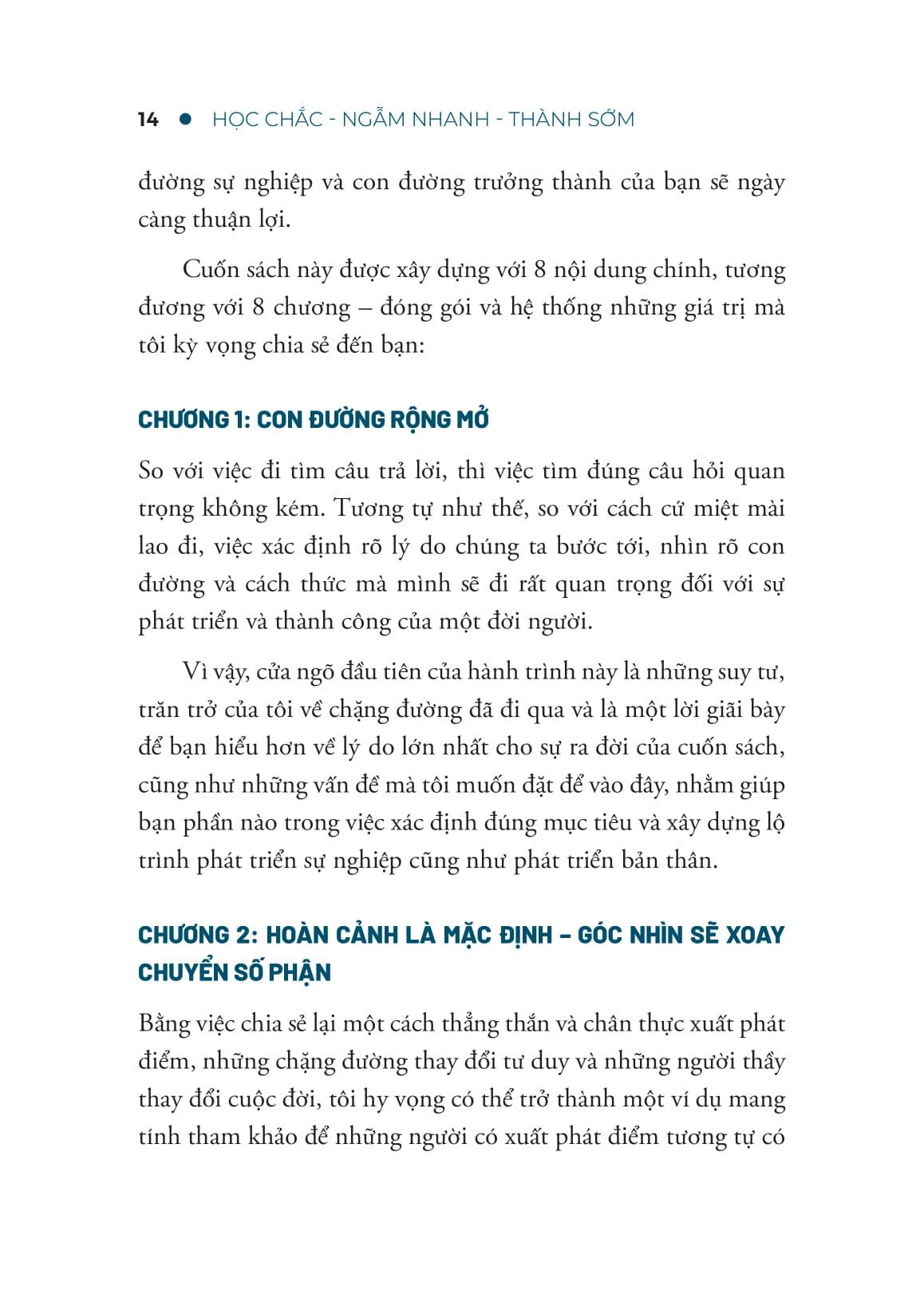 Cuốn sách "Học Chắc - Ngẫm Nhanh - Thành Sớm" là sự chia sẻ về hành trình phát triển sự nghiệp và bản thân của tác giả Nguyễn Minh Tuấn. Với cấu trúc 8 chương, tác giả truyền tải các bài học quý giá về việc học hỏi, suy ngẫm, và đạt được thành công sớm. Qua những trải nghiệm cá nhân, tác giả nhấn mạnh tầm quan trọng của việc học chắc – xây dựng nền tảng vững chắc, ngẫm nhanh – rút ra bài học từ thực tiễn, và từ đó đạt được thành công một cách chủ động. Nội dung không chỉ giới hạn ở lý thuyết mà còn đậm tính thực hành, giúp người đọc ứng dụng ngay vào công việc và cuộc sống, hướng tới phát triển bản thân và xây dựng sự nghiệp bền vững.