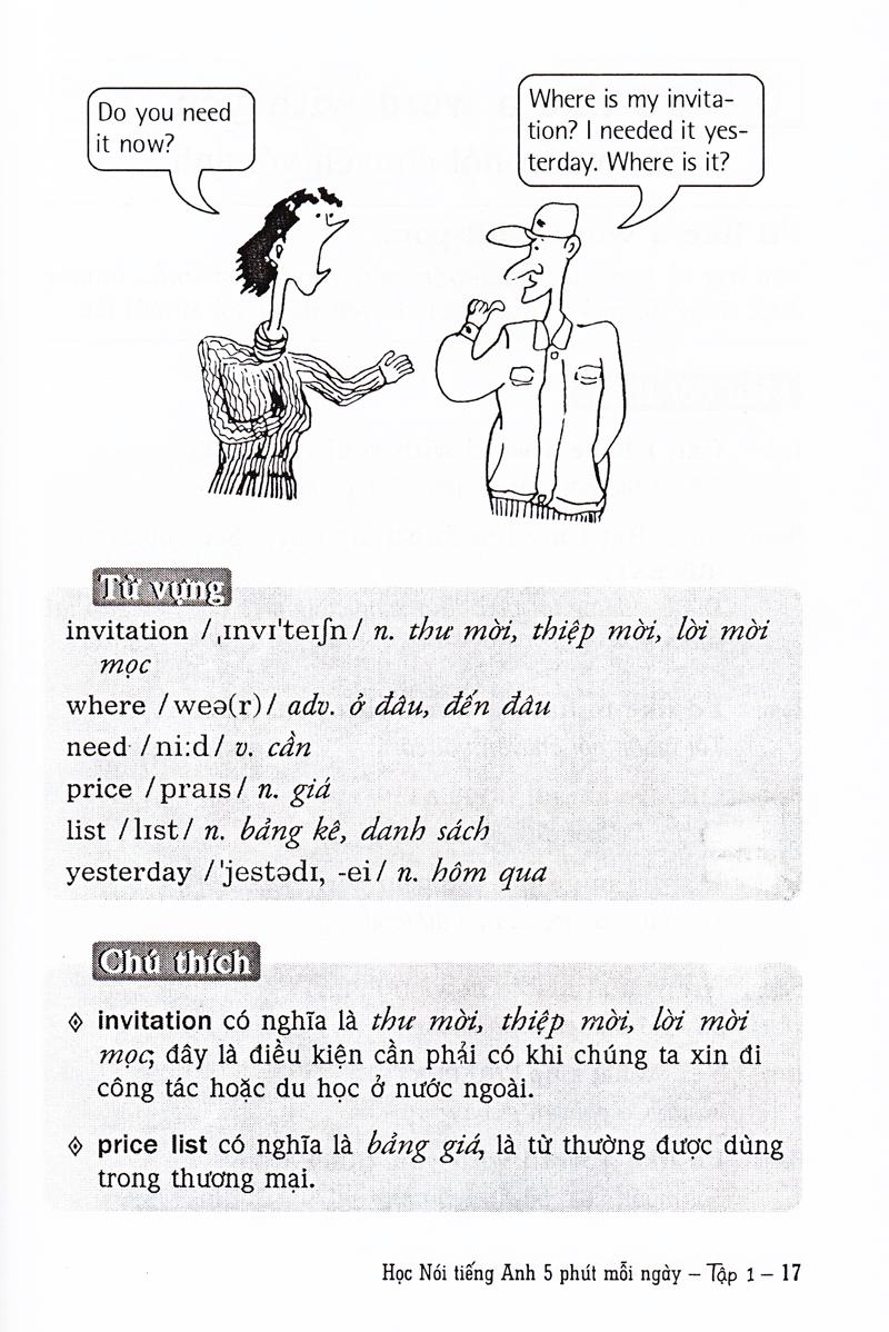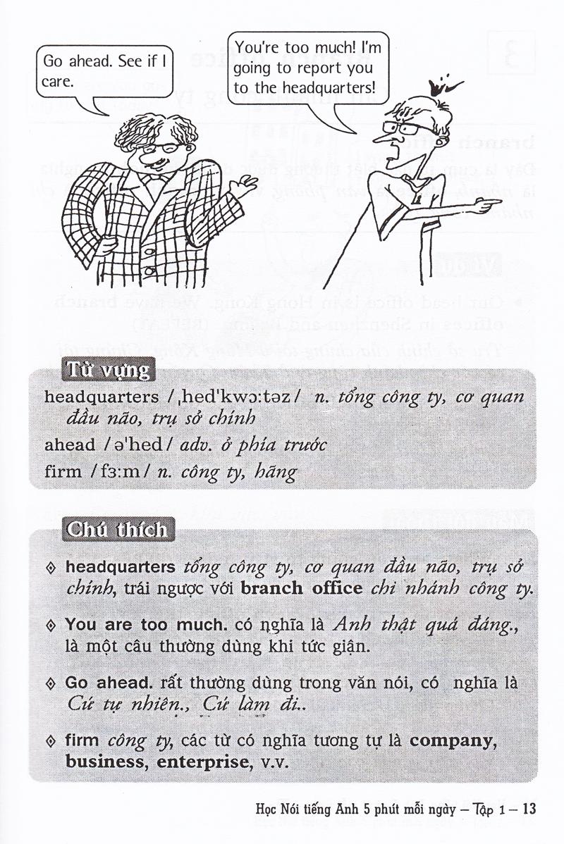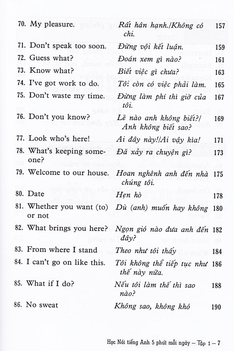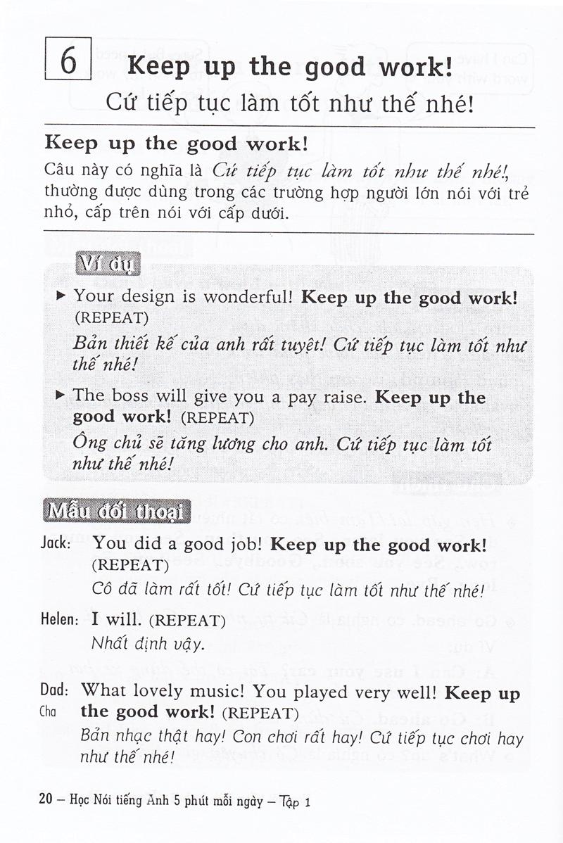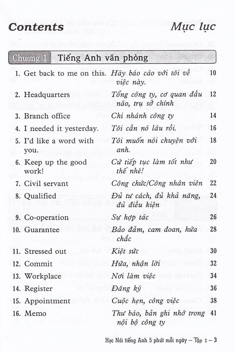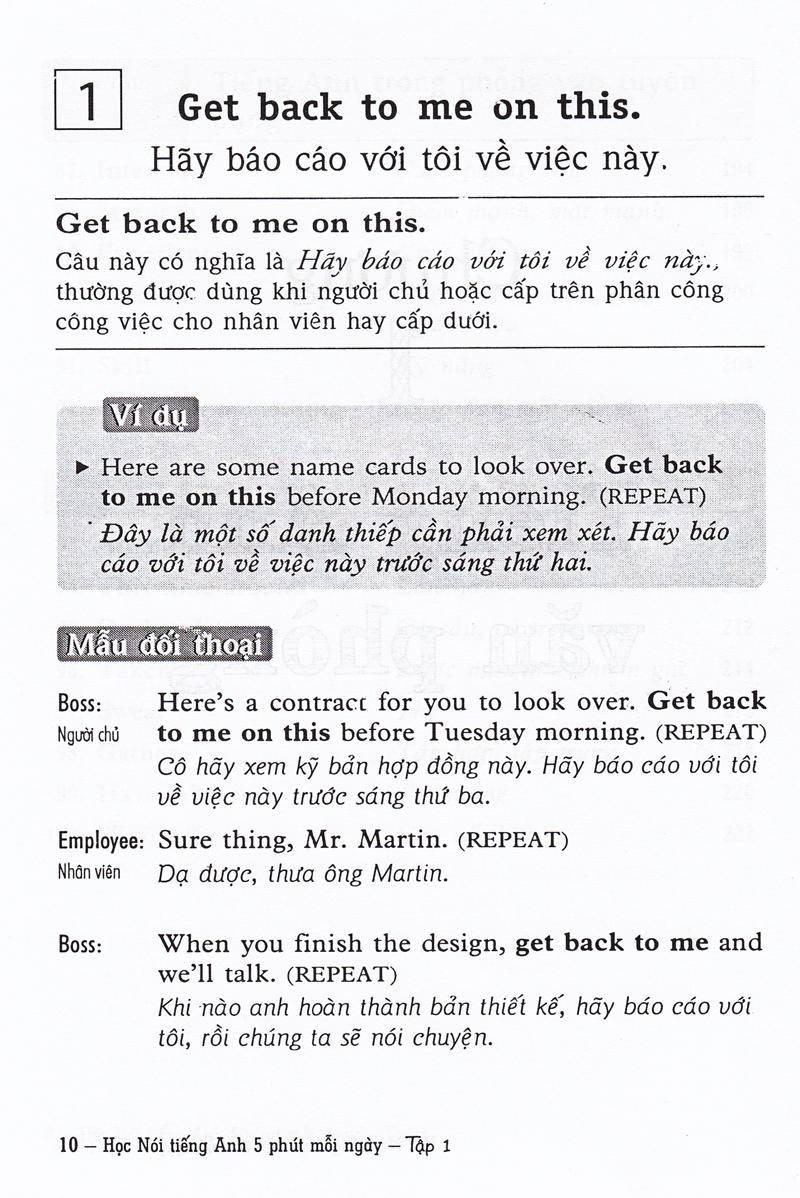 Với cuốn sách Học Nói Tiếng Anh 5 Phút Mỗi Ngày - Tập 1, các bạn sẽ được hướng dẫn các mẫu , tình huống đàm thoại quen thuộc. Nội dung cuốn sách được chia thành các nội dung chính như sau: