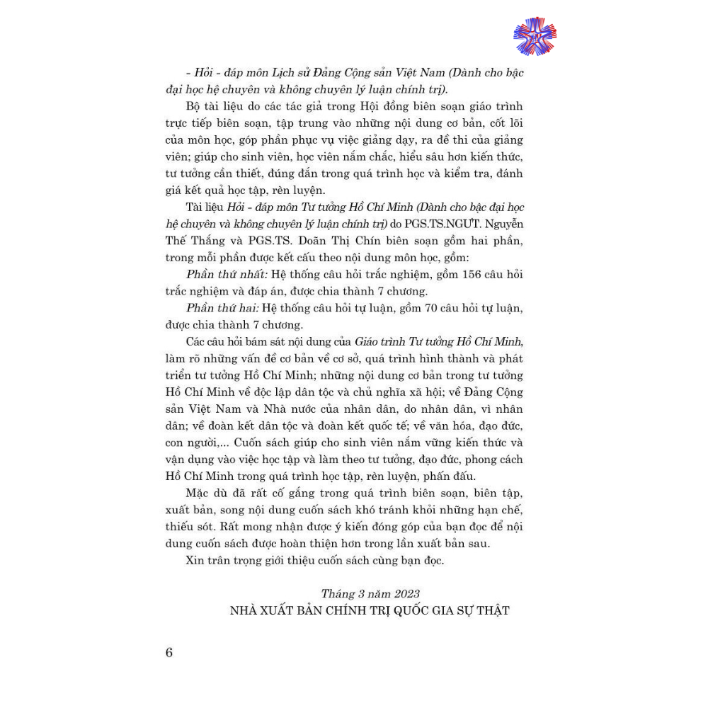 Các câu hỏi bám sát nội dung của Giáo trình Tư tưởng Hồ Chí Minh, làm rõ những vấn đề cơ bản về cơ sở, quá trình hình thành và phát triển tư tưởng Hồ Chí Minh; Những nội dung cơ bản trong tư tưởng Hồ Chí Minh về độc lập dân tộc và chủ nghĩa xã hội; về Đảng Cộng sản Việt Nam và Nhà nước của nhân dân, do nhân dân, vì nhân dân; Về đoàn kết dân tộc và đoàn kết quốc tế; Về văn hóa, đạo đức, con người, Cuốn sách giúp sinh viên nắm vững kiến thức và vận dụng vào việc học tập và làm theo tư tưởng, đạo đức, phong cách Hồ Chí Minh trong quá trình học tập, rèn luyện, phấn đấu.