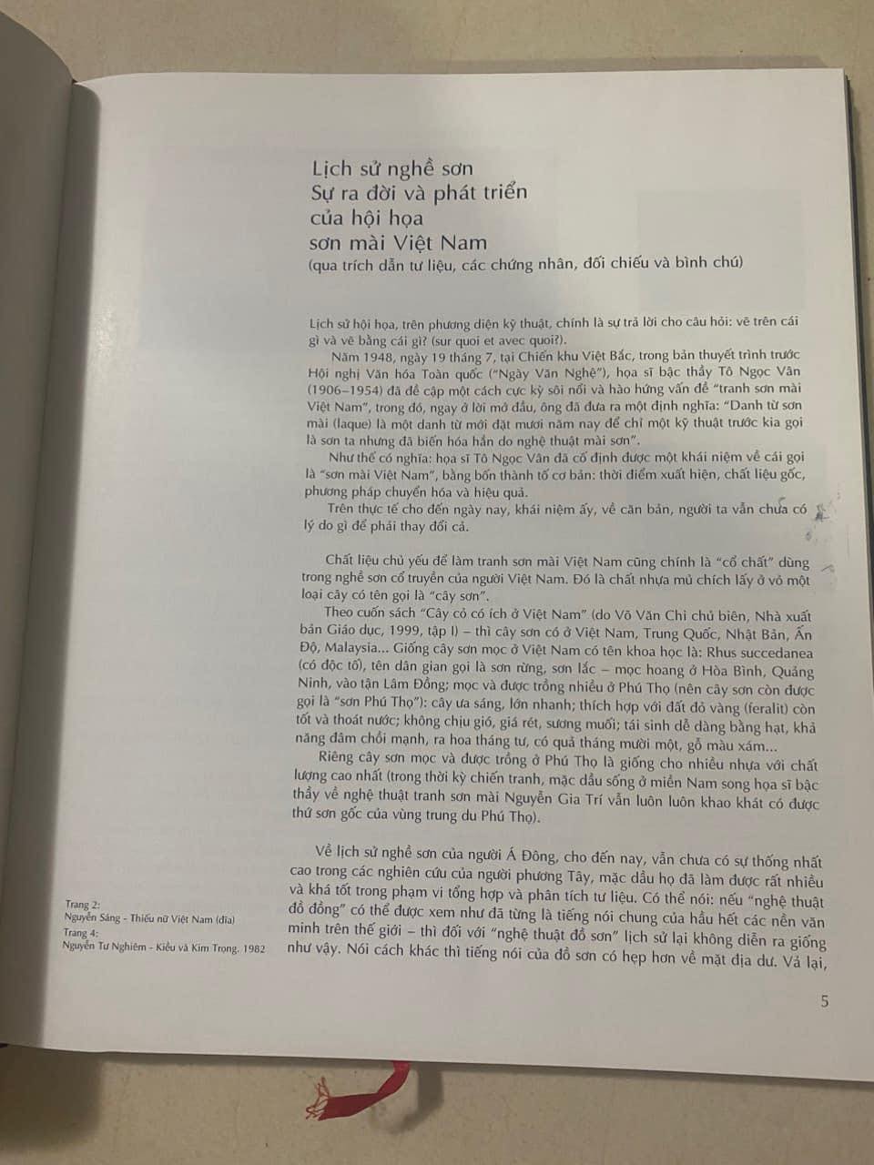 Lịch sử của hội họa trên phương diện kỹ thuật, chính là sự trả lời cho câu hỏi: vẽ trên cái gì và vẽ bằng cái gì? Chất liệu chủ yếu để làm tranh sơn mài Việt Nam cũng chính là cổ chất dùng trong cổ sơn của người Việt Nam. Đó là chất nhựa mủ chích lấy ở vỏ một loại cây có tên gọi là cây sơn. Từ đó suy ra thì sơn mài chính là chất liệu hội họa cực kỳ độc đáo mang tính đặc thù dân tộc của Việt Nam, cho dù đã đạt đến đỉnh cao ở đủ các môn khác, tấm lòng khắc khoải, khát khao của các nghệ sĩ vẫn canh cánh hướng về nó. Tác giả cuốn sách đã dày công tuyển chọn và tổng hợp những tư liệu cơ bản về lịch sử hình thành, quá trình phát triển, những thành tựu nổi bật của hội họa sơn mài Việt Nam. Đồng thời, nội dung chính của sách tập trung giới thiệu những tác phẩm đặc sắc của nhiều họa sĩ: Trần Văn Cẩn, Đỗ Đức Khải, Hoàng Tích Chù, Nguyễn Gia Trí Điểm cốt lõi của các bức tranh là đề cao được không khí Việt Nam, cái đẹp thể hiện tâm lý thời đại, tâm lý dân tộc. Sách in màu đẹp mắt, chất liệu giấy tốt, sáng rõ. Đây là tài liệu hữu ích và ý nghĩa cho những ai muốn tham khảo tìm hiểu thêm về nghệ thuật hội họa sơn mài Việt Nam.