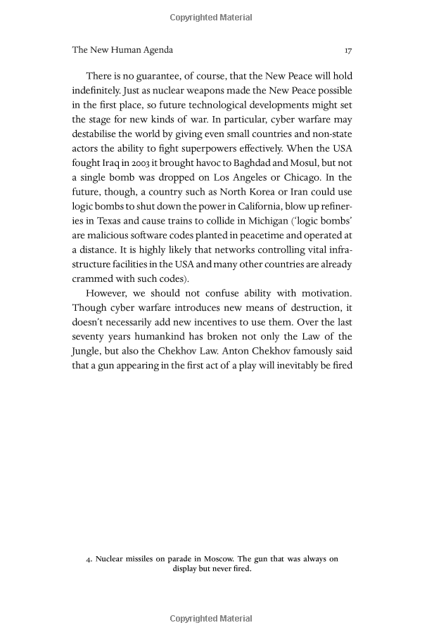 Over the past century humankind has managed to do the impossible and rein in famine, plague, and war. This may seem hard to accept, but, as Harari explains in his trademark style--thorough, yet riveting--famine, plague and war have been transformed from incomprehensible and uncontrollable forces of nature into manageable challenges. For the first time ever, more people die from eating too much than from eating too little; more people die from old age than from infectious diseases; and more people commit suicide than are killed by soldiers, terrorists and criminals put together. The average American is a thousand times more likely to die from binging at McDonalds than from being blown up by Al Qaeda.