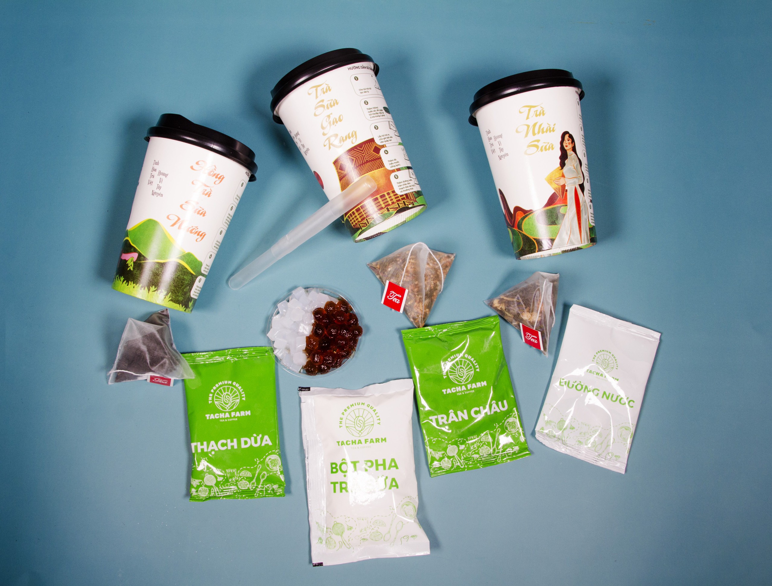 Trong 1 ly trà sữa tự pha TACHA FARM vị Hồng Trà sữa nướng gồm: - 1 Túi trà túi lọc vị hồng trà nướng - 1 túi bột pha trà sữa - 1 túi
