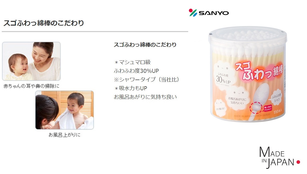 HỘP 110 TĂM BÔNG NGOÁY TAI MỀM KHÁNG KHUẨN, AN TOÀN SANYO - HÀNG NỘI ĐỊA NHẬT BẢN (Sản phẩm được nhập khẩu chính hãng từ Nhật Bản) ■ Xuất xứ: Nhật Bản / MADE IN