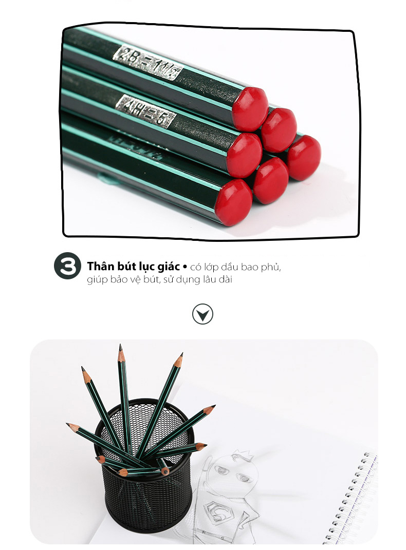 Kích cỡ: 175x8mm Độ cứng ngòi bút: 2B Cán bút: Cán bút 6 cạnh Đầu bút có tẩy hay không: không Quy cách: một hộp màu có 12 chiếc Chế tạo chất liệu tinh xảo