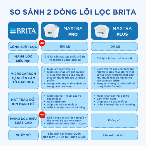 Lõi lọc BRITA Maxtra Pro: Công suất: 150 lít Màng lọc siêu mịn: Giữ lại các hạt tạp chất thô từ hệ thống đường ống cũ MicroCarbon tự nhiên làm từ gáo dừa: - Giúp
