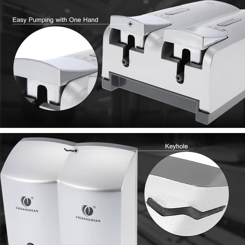 The double chamber liquid soap dispensers are made of new and good quality ABS, which is durable, compact and in sleek looking. The pump is designed for easy pumping with one hand. The separated outlet liquid nozzle is perfect to avoid leaking and waste. Perfect for hotel, shopping mall, office building, bathroom, toilet, school, kindergarten, banks and other public places.