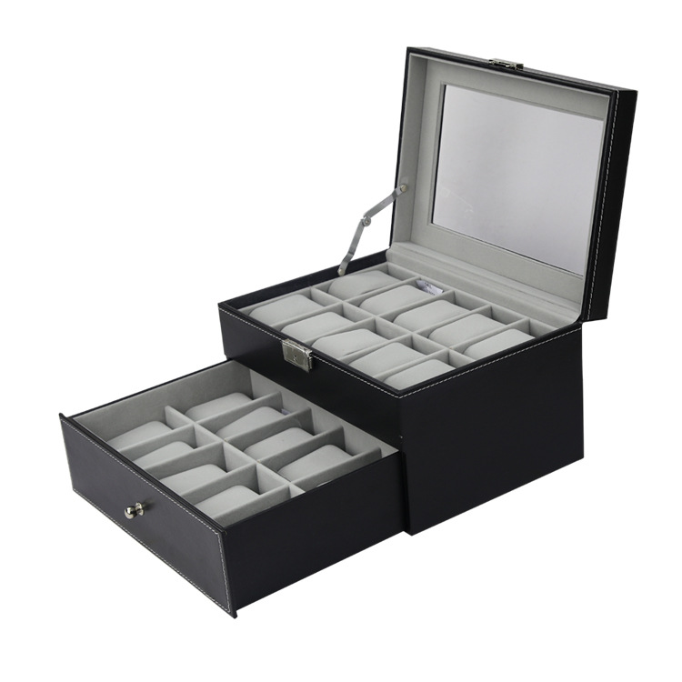 - Hộp thiết kế 2 tầng mỗi tầng đựng 10 cái đồng hồ, tầng trên có khóa, tầng dưới kiểu ngăn kéo