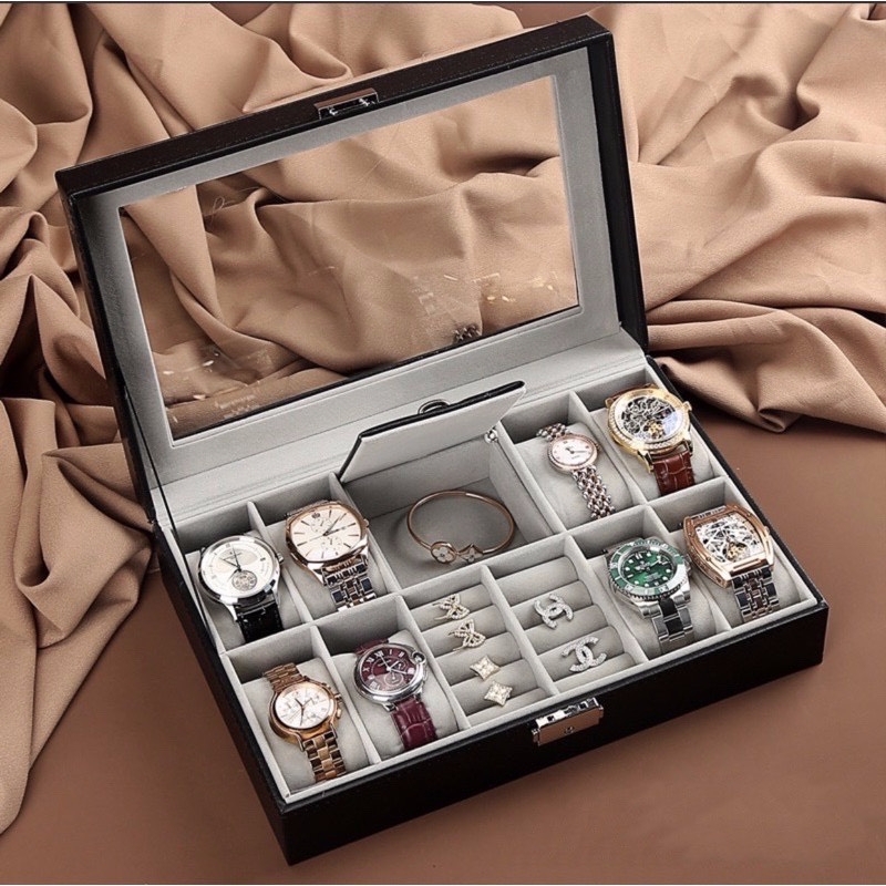 Bạn có khoảng 6-8 chiếc đồng hồ và phụ kiện trang sức như nhẫn, vòng ùng với đó bạn thích hộp có mặt kính để nhìn thấy phụ kiện bên trong hộp và hộp có khóa để nhiều khi tránh bé nhỏ nghịch ngợm. Chẳng còn phải băn khoăn gì nữa vì đây chính là hộp bạn đang cần