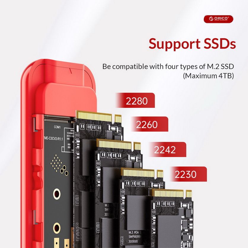 Hộp ORICO tương thích với các loại SSD chuẩn M.2 SATA bao gồm các kích thước 2230, 2242, 2260, 2280, đáp ứng nhu cầu sử dụng của nhiều dòng ổ cứng phổ biến hiện nay.