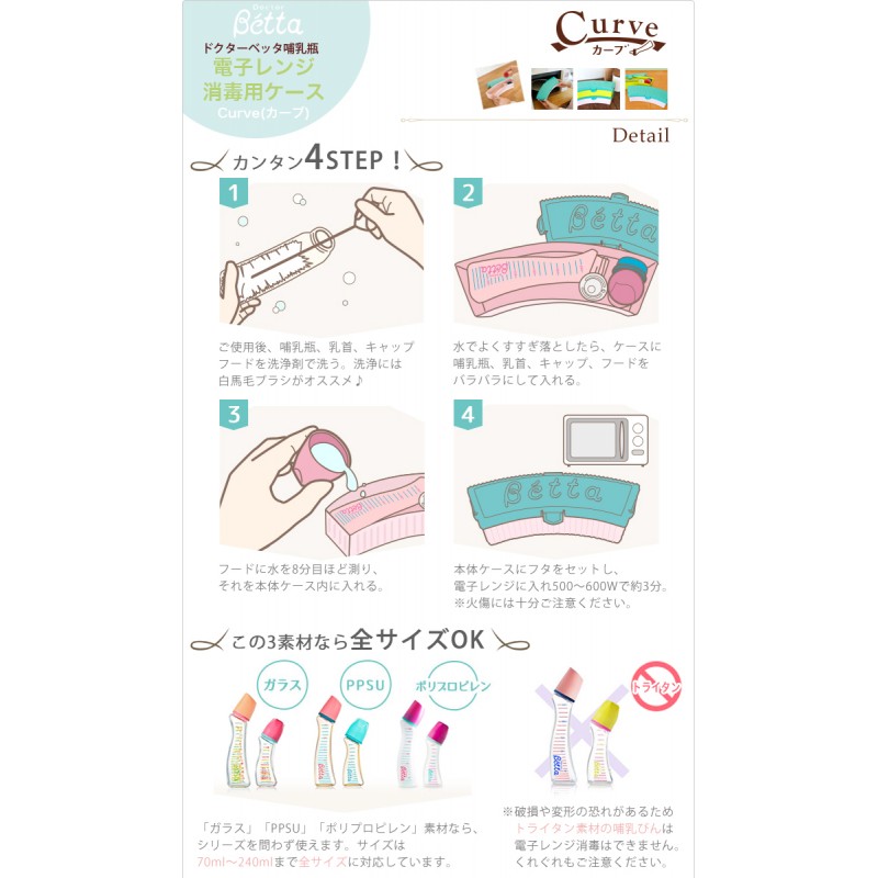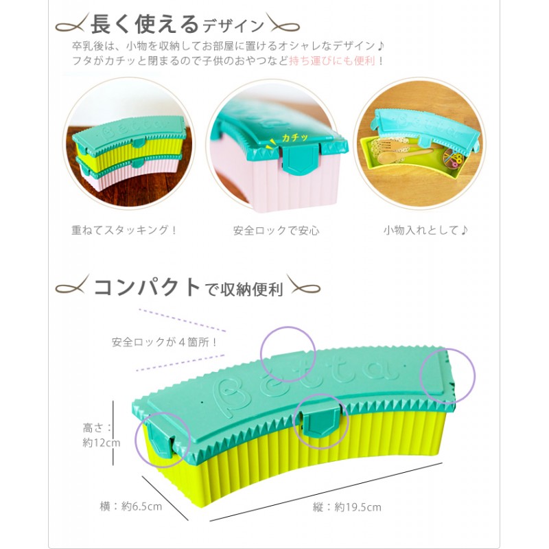Hộp đựng tiệt trùng trong lò vi sóng Dr Betta màu vàng chanh vừa vặn với mọi kích thước bình Betta. Hộp đựng có 4 chốt vô cùng chắc chắn, an toàn khi sử dụng, cho bình sữa Betta vào trong hộp, sau đó cho vào lò vi sóng, để có thể ngăn chặn sự xâm nhập của vi khuẩn so với việc đặt bình trực tiếp vào trong lò. Sau khi trẻ ngừng ăn sữa, hộp đựng có thể tận dụng để đựng những vật dụng nhỏ hay là đồ chơi.