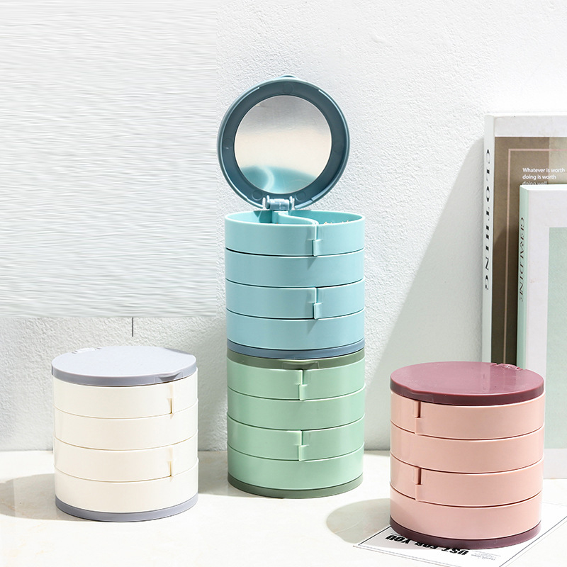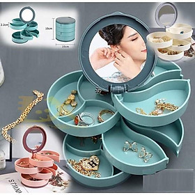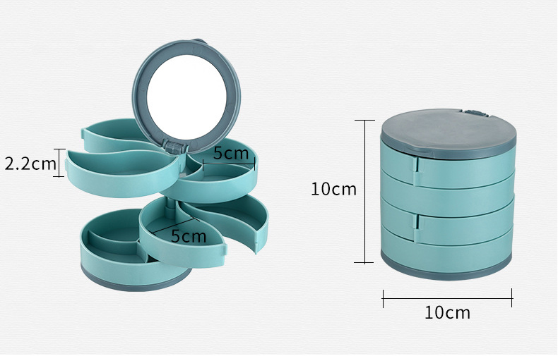 Hộp tròn đựng trang sức xoay 4 tầng nhỏ gọn, tiện lợi cho bạn thỏa sức đựng các loại phụ kiện, khuyên tai, lắc/vòng tay một cách ngăn nắp.