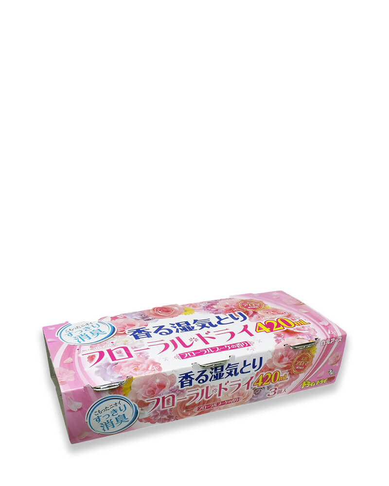 Hộp Hút Ẩm Và Làm Thơm Ngăn Tủ (Hương Hoa Thiên Nhiên) Hakugen Earth giúp hút ẩm và khử mùi hôi trong tủ quần áo, tủ giày, từ đó hạn chế sự hình thành của nấm mốc và mang đến hương hoa thơm dịu nhẹ. Hiệu quả hút ẩm và khử mùi hôi có thể kéo dài từ 2-6 tháng tùy vào độ ẩm trên thực tế. Mỗi hộp hút ẩm chia thành 3 hộp nhỏ, mỗi hộp nhỏ có thể chứa tối đa 420ml dịch. Tối đa sau 1 năm sử dụng phải thay mới sản phẩm.