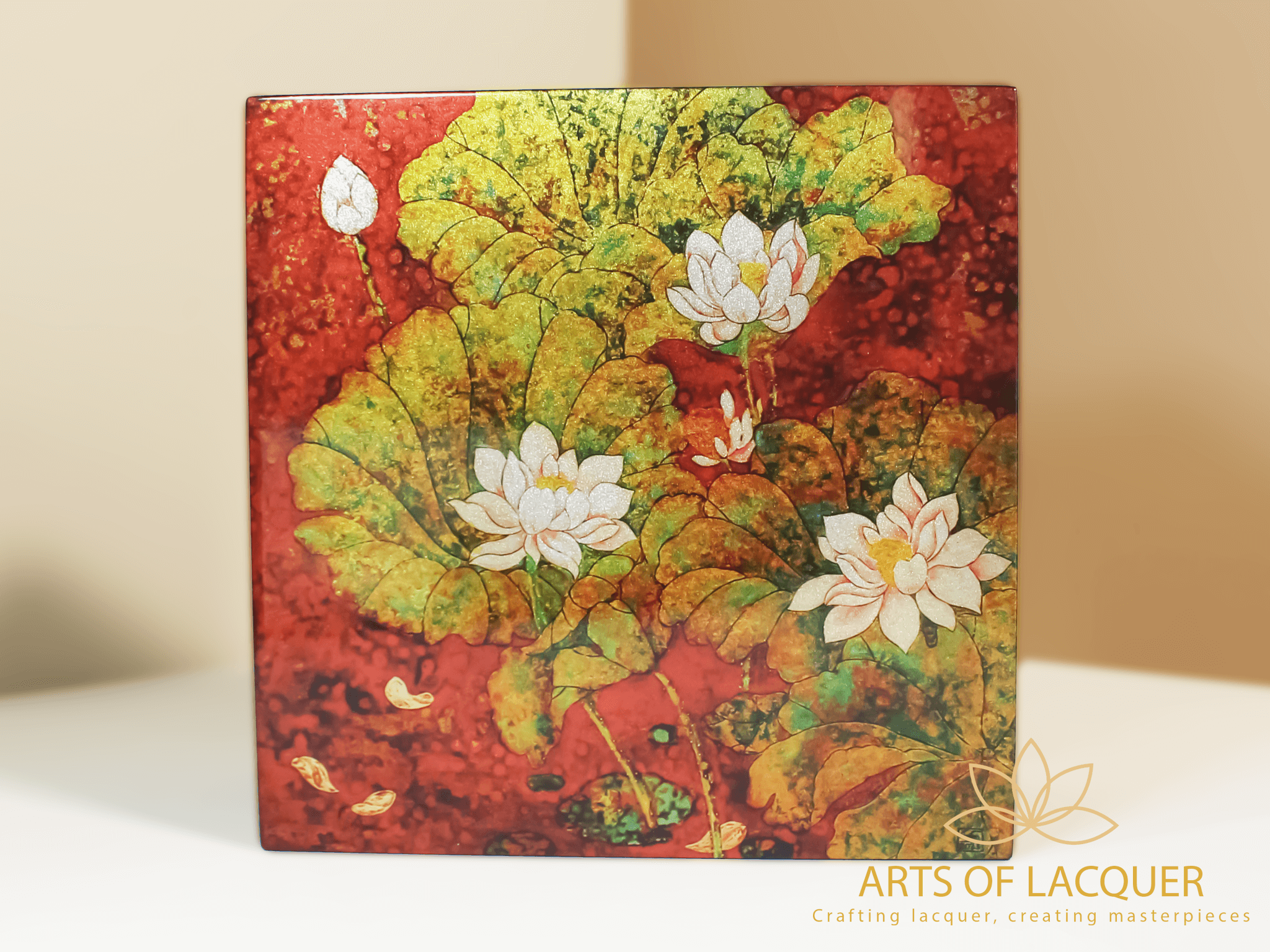 Sản phẩm trong hình là "Hộp Lưu Niệm Sơn Mài Họa Tiết Ao Hoa Sen" từ Arts of Lacquer. Hộp có thiết kế vuông với nền màu đỏ, được trang trí bằng hình ảnh hoa sen trắng và lá sen xanh trên nền đỏ, mang lại cảm giác nghệ thuật và thanh lịch.