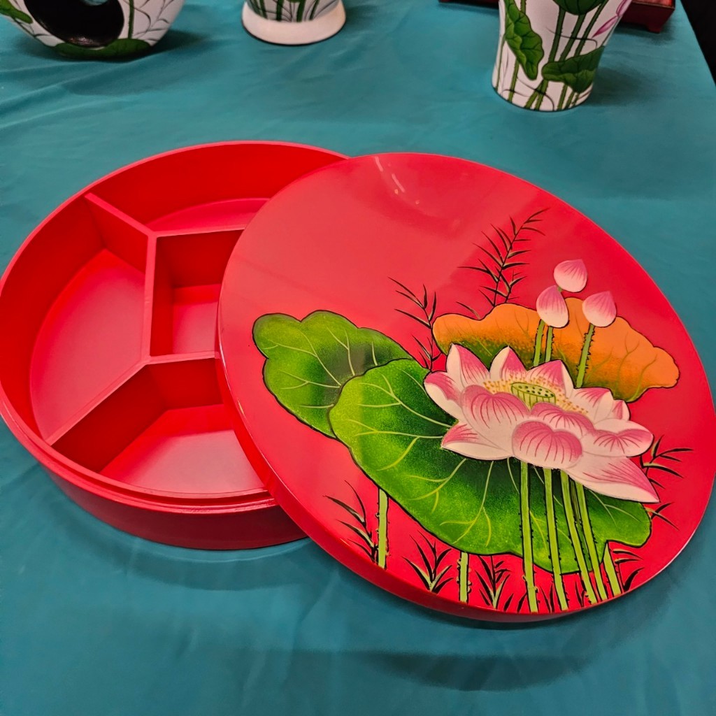 Hộp đựng mứt Tết sơn mài tròn là mẫu hộp cơ bản và truyền thống nhất., bạn có thể từng thấy qua các thiết kế hộp với chất liệu nhựa đơn giản, kém sang trọng. Thì nay chiếc hộp đựng mứt Tết sơn mài sẽ cao cấp và đáng giá hơn.