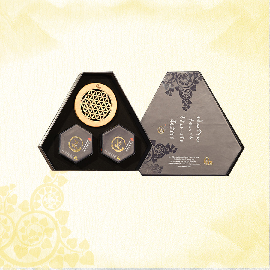 Hộp quà tặng Vô Ưu được cách điệu từ chiếc lá bồ đề hình trái tim để gửi gắm thông điệp bi trí dũng một cách mạnh mẽ, hiểu rồi thương và sẽ chia, nỗ lực tu rèn bản thân và dũng mãnh kiên định được vun đắp bởi từ bi và trí huệ sẽ không lay chuyển bởi uy quyền, lợi lạc và không chùn bước trước những khó khăn. Và không phải ngẫu nhiên mà tên Vô Ưu được chọn cho set quà tặng này, sau tất cả, tận trong sâu thẳm trong tâm hồn mỗi người, chỉ cần an yên là đủ, không muộn phiền, không đua tranh, không lợi lộc giàu sang. Trở về với Vô Ưu với thật con người mình là đủ.  SET HỘP QUÀ TẶNG VÔ ƯU GỒM: