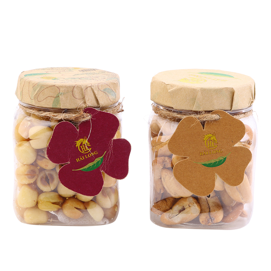 Hộp Quà Hải Long 15A bao gồm Điều rang muối vỏ lụa (230g) và Mứt gừng nướng mật ong (120g), là sự kết hợp giữa vị béo bùi, mặn mặn của hạt điều rang và