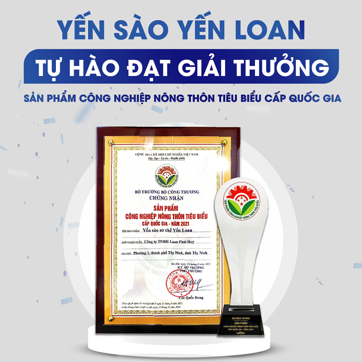 Năm 2021 sản phẩm Yến sào sơ chế đạt danh hiệu là sản phẩm công nghiệp nông thôn tiêu biểu cấp Quốc gia.