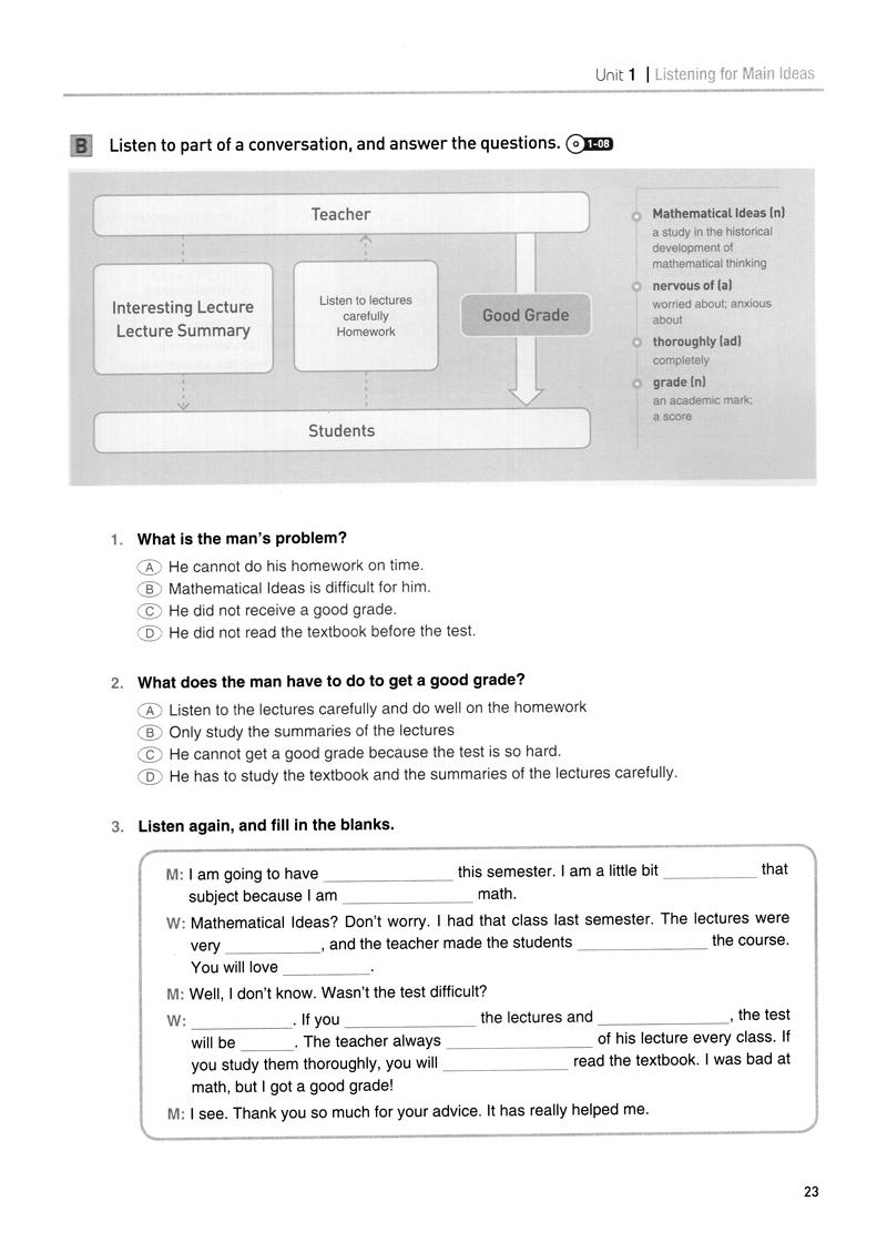 Intensive practice of all the question types on the TOEFL® iBT Graded listening passages with various topics that frequently appear on the TOEFL® iBT Glossed vocabulary to help students understand the passages better Well-organized notes to show the structures and main points of the passages To-the-point practice to build summary skills Integrated listening and speaking activities Eight practice tests and one complete tests that familiarize students with the actual test format Vocabulary exercises and lists to help students expand their vocabulary Full answer key