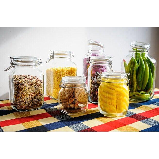 Nắp đậy thủy tinh kín hơi với miếng đệm cao su và khóa cài an toàn bằng kim loại có thể tháo rời giúp giữ thực phẩm tươi ngon hơn. Thủy tinh dầy, có độ bền cao và an toàn khi dùng cất trữ thực phẩm.