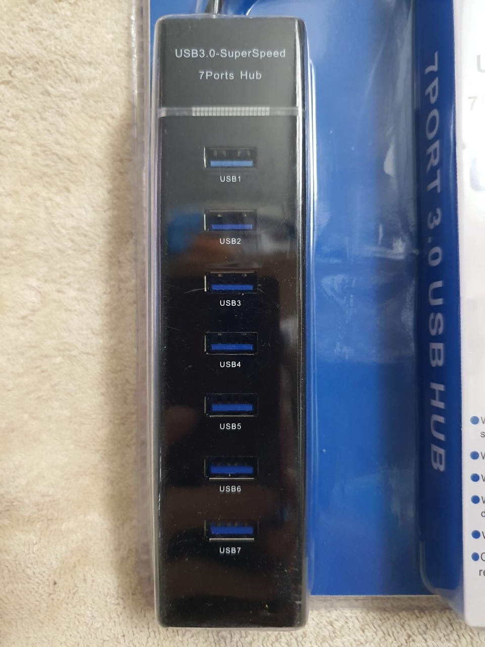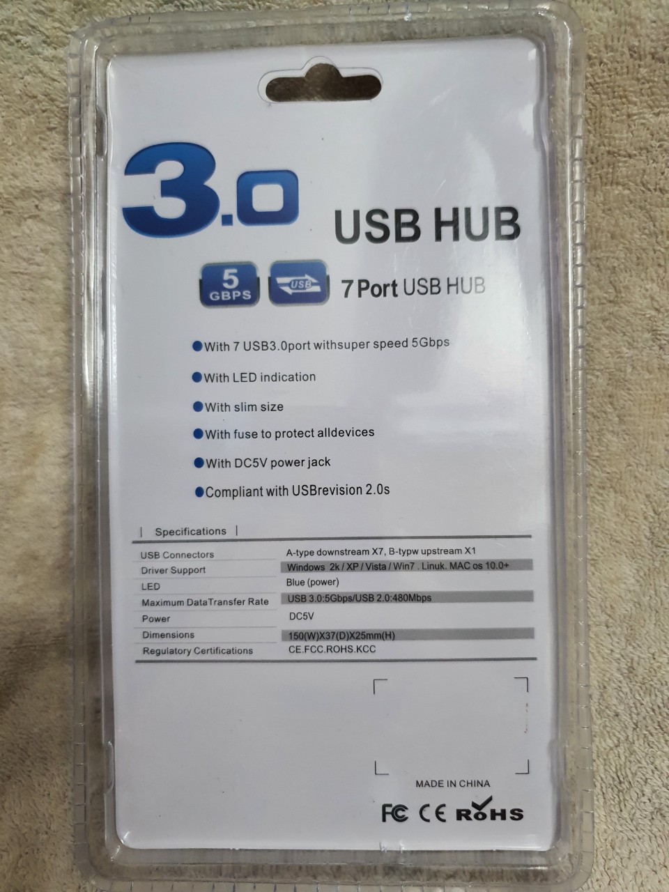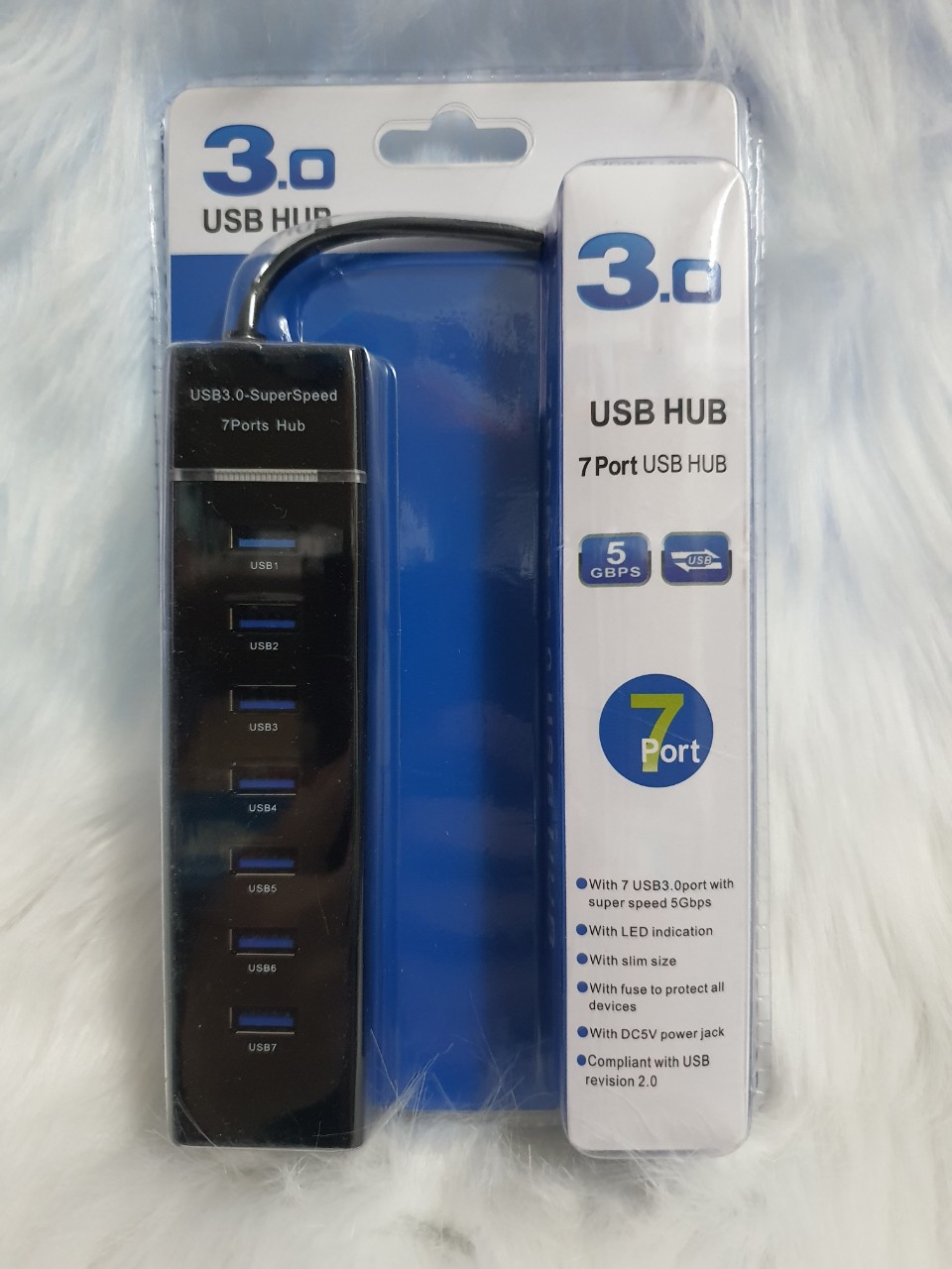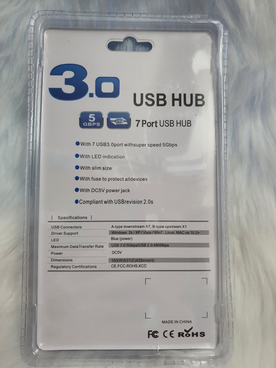 1.Input: 1x USB-C Female (data transfer only) 2.Output: 7x USB3.0 Female 3.Total Output: 5V/3.4A Max 4.Power Supply: DC 5.5mm, 12V/2A 5.USB3.0 5Gbps 6.Compliance with BC 1.2 fast charging protocol (only available for USB3.0 ports from