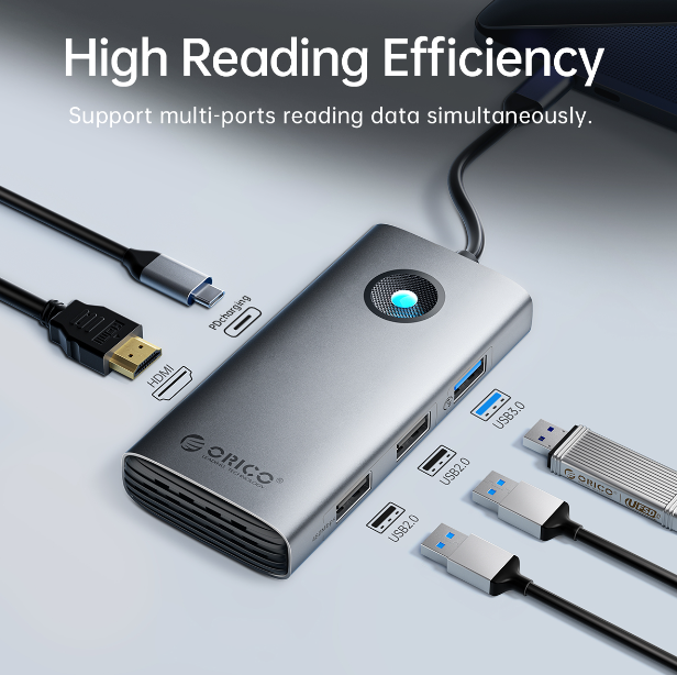 - Hub ORICO PW11-6PR-SV-EP cung cấp tất cả các cổng kết nối cần thiết chỉ trong một thiết bị nhỏ gọn, giúp bạn dễ dàng kết nối nhiều thiết bị cùng lúc mà không cần phải mang theo nhiều phụ kiện phức tạp.