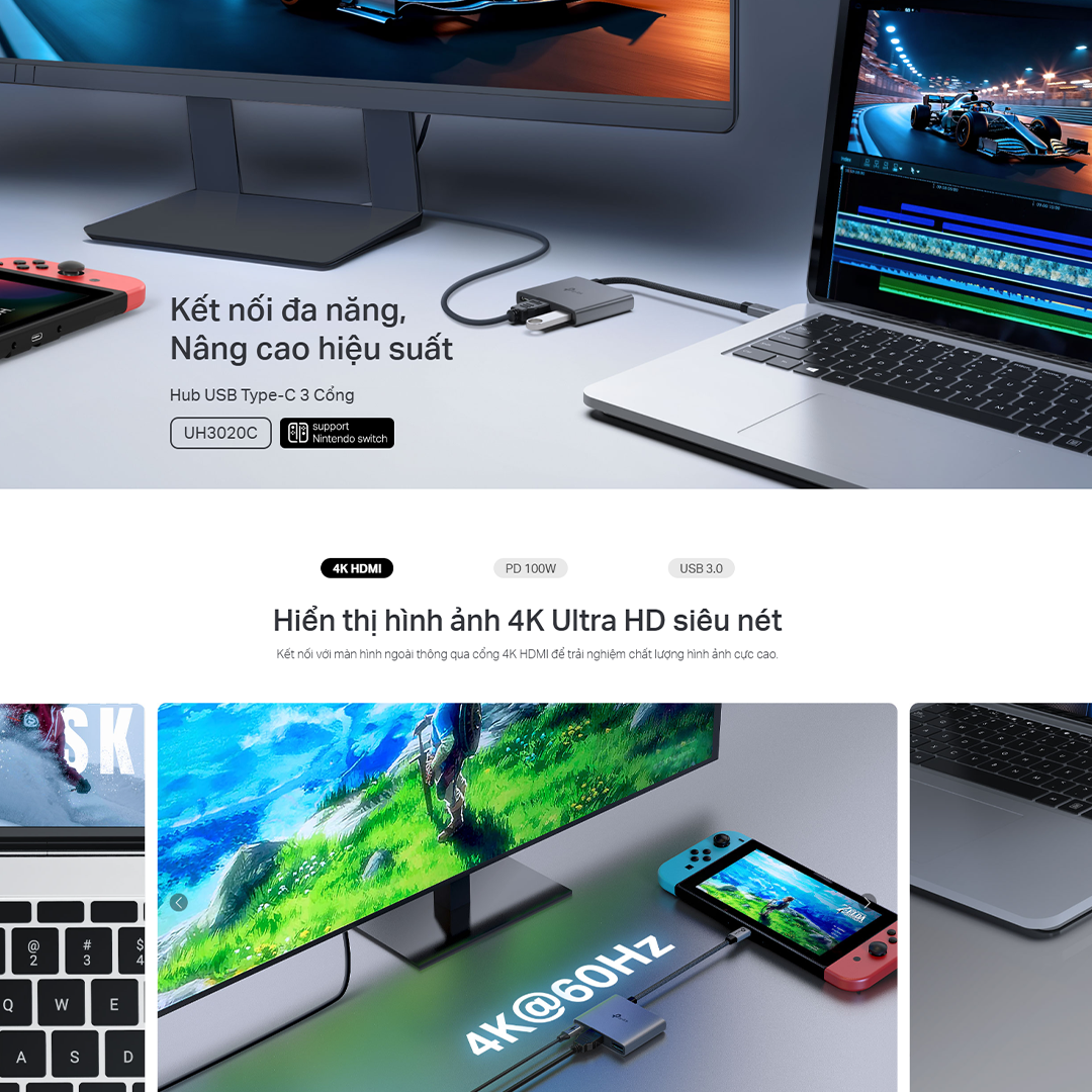 - Hub USB-C 3 trong 1: Biến 1 cổng USB-C thành 3 cổng: 1 cổng HDMI 4K@60Hz, 1 cổng sạc nhanh PD 100W và 1 cổng USB-A.
