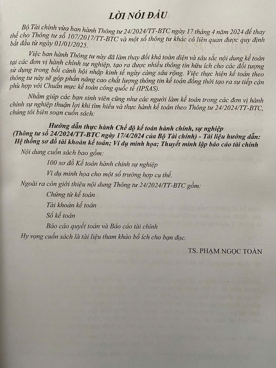 Nhằm giúp các bạn sinh viên cũng như các người làm kế toán trong các đơn vị hành chính sự nghiệp thuận lợi khi tìm hiểu và thực hành kế toán theo Thông tư 24/2024/TT-BTC, TS. Phạm Ngọc Toàn biên soạn cuốn sách: Hướng dẫn thực hành Chế độ kế toán hành chính, sự nghiệp theo Thông tư số 24/2024/TT-BTC ngày 17/4/2024 của Bộ Tài chính