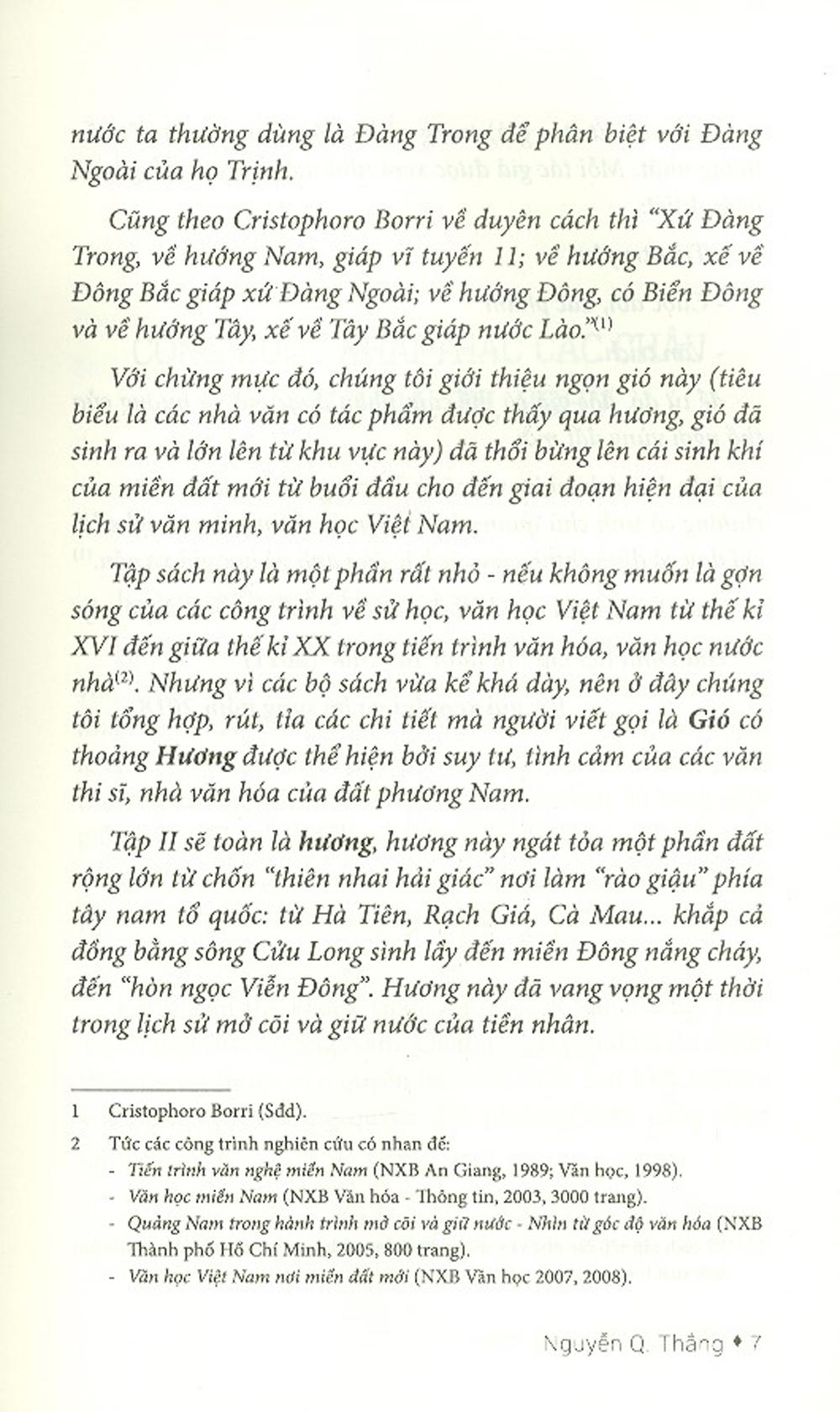 Tập sách này là một phần rất nhỏ - nếu không muốn là gợn sóng của các công trình về sử học, văn học Việt Nam từ thế kỉ XVI đến giữa thế kỉ XX trong tiến trình văn hóa, văn học nước nhà. Nhưng vì các bộ sách vừa kể khá dày, nên ở đây chúng tôi tổng hợp, rút, tỉa các chi tiết mà người viết gọi là Gió có thoảng Hương được thể hiện bởi suy tư, tình cảm của các văn thi sĩ, nhà văn của đất phương Nam.