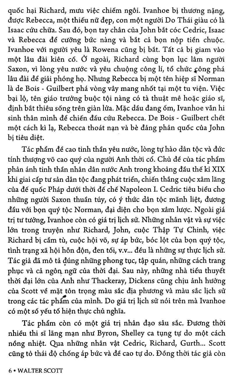 Ivanhoe là tiểu thuyết hư cấu lịch sử nổi tiếng nhất của nhà văn Walter Scott. Truyện lấy bối cảnh là nước Anh thế kỉ XII, một thời kì loạn lạc với những mâu thuẫn cao độ về văn hóa, quan niệm, tín ngưỡng, ngôn ngữ và lối sống. Những nhân vật và sự kiện lớn trong truyện chủ yếu dựa trên sự kiện lịch sử có thật, nhưng được xây dựng một cách sinh động, đầy lôi cuốn qua trí tượng tưởng phong phú và ngòi bút lãng mạn của tác giả.