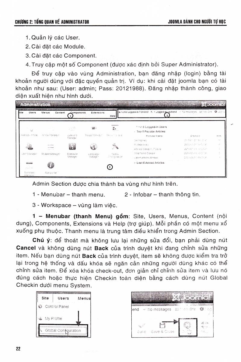 Chương 2: Tổng quan về administrator: Phần quản trị là trung tâm điều khiển của website Joomla. Phần này giúp các bạn biết cách sử dụng giao diện đơn giản, thân thiện của AdminSection để xây dựng cấu trúc và biên tập, xuất nội dung.