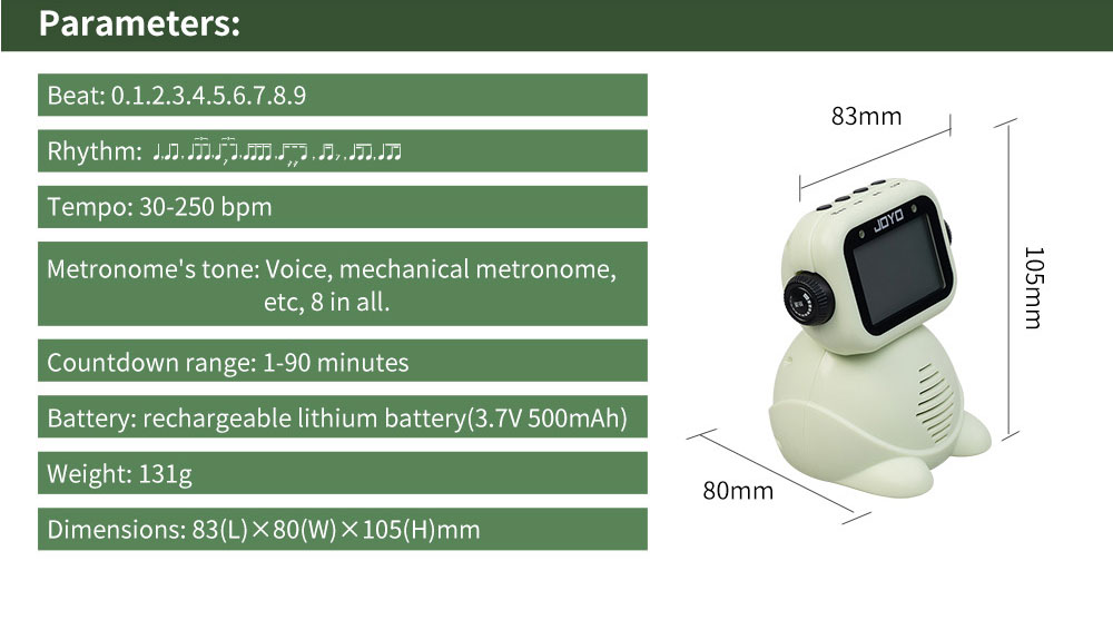 - Ứng Dụng rộng rãi: dung được cho tất cả các nhạc cụ như piano, guitar, Bộ trống, đàn Tam thập lục, v. v. Thông số kỹ thuật: Màu sắc: Trắng/Matcha/Hồng (Tùy Chọn) Chất liệu: ABS Beat: 0, 1, 2, 3, 4, 5, 6, 7, 8, 9 Nhịp độ (Tempo): 30 ~ 250bpm Sound: Giọng Nói, mechanical beat, v. , 8 tiếng tất cả. Countdown Range: 1 ~ 90 phút Nguồn Điện: DC 5V Type-C Công Suất định mức: 2.5W Pin: Built-in 3.7V 500mAh pin lithium Kích Thước sản phẩm: 1058380mm / 4.133.26 3.15in Trọng Lượng sản phẩm: 119g / 4.21oz Trọng Lượng gói hàng: 200g / 7.07oz Kích Thước đóng gói: 129.59cm / 4.723.54 3.74in Danh Sách đóng gói: 1 Máy đếm nhịp 1 Cáp Type-C 1 * Hướng dẫn sử dụng (Tiếng Anh)