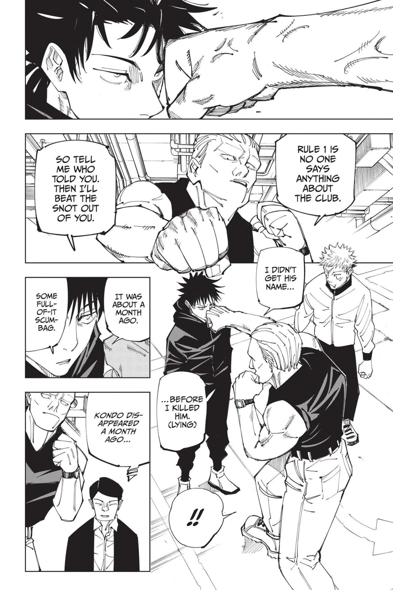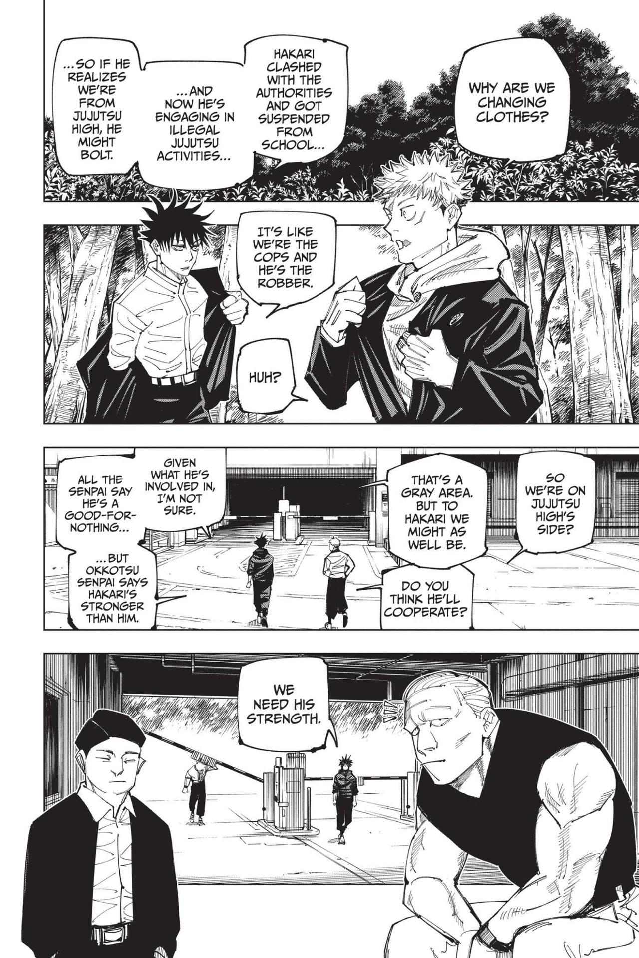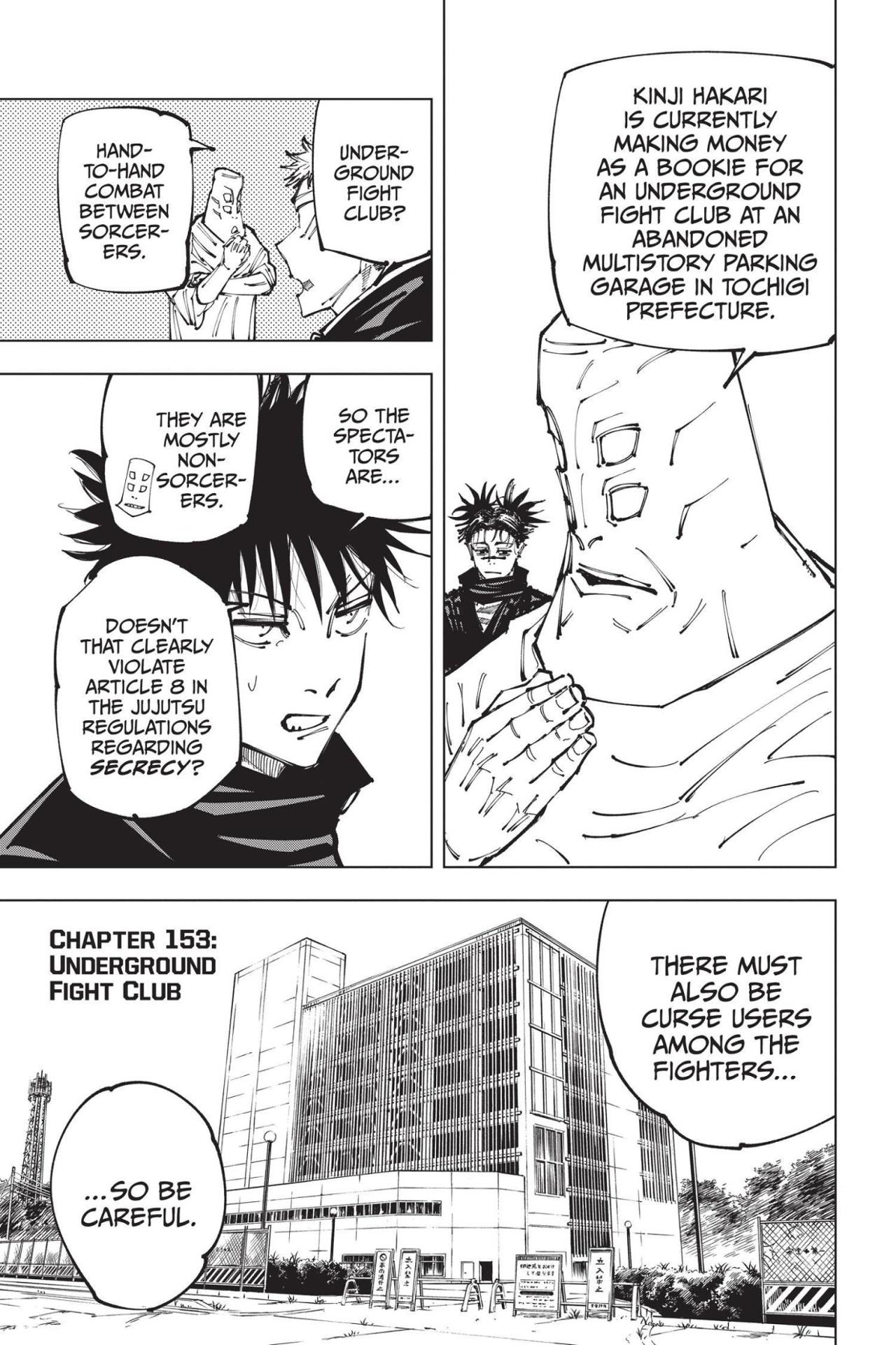 In to thwart the culling game, Itadori needs the help of Kinji Hakari, a third-year who is currently suspended from Jujutsu High, so he decides to participate in an underground fight club where Hakari works as a bookie. Meanwhile, Fushiguro infiltrates the fight club and heads for Hakari’s base of operations, but another Jujutsu High third-year is using their cursed technique to block his way!