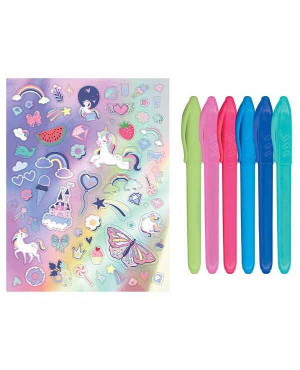 This includes 6 markers and over 60 holographic stickers to brighten the images! • Includes 6 markers and over 60 holographic stickers